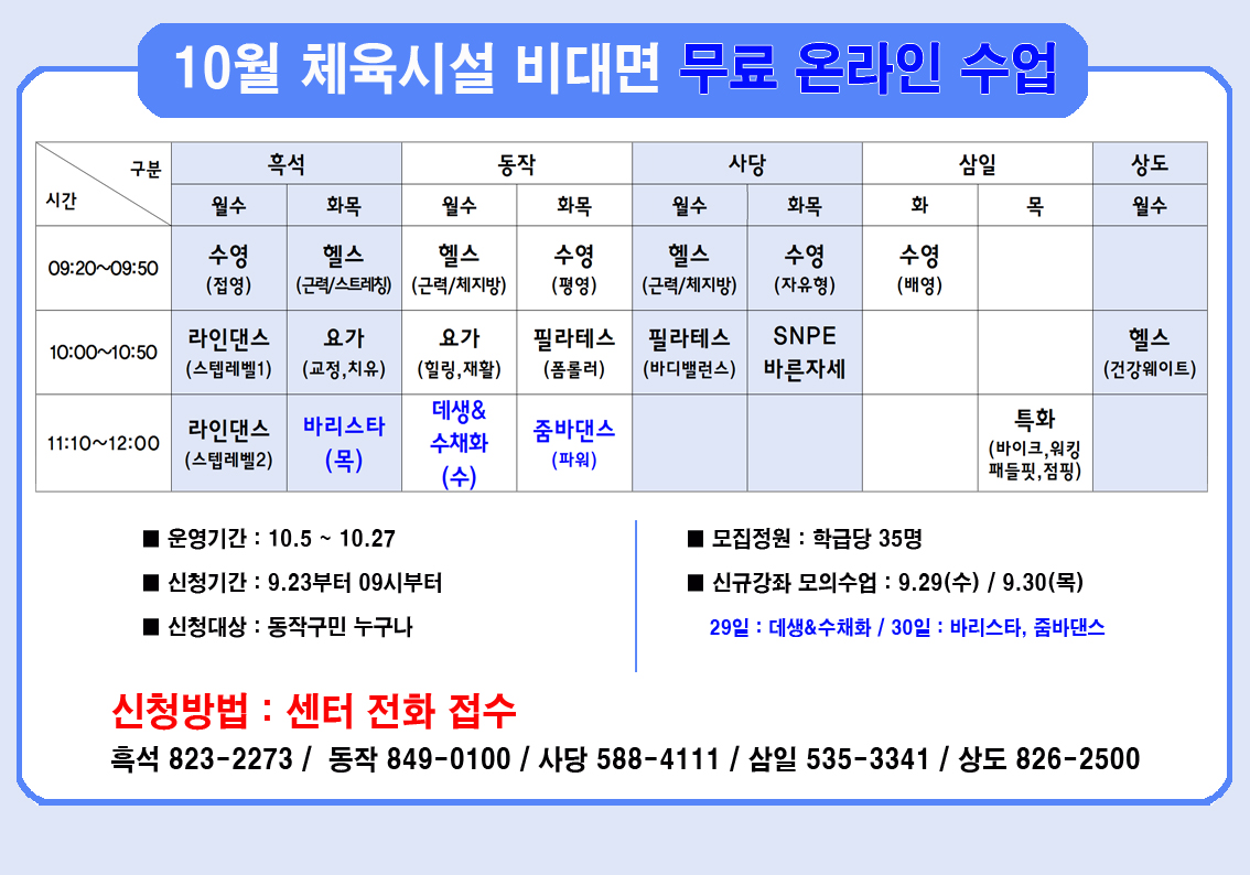 전체 10월 무료 비대면 온라인수업 회원모집 작성자 사당문화회관 작성일 2021년 9월 23일 10시 15분 40초 조회 1,047 10월온라인 수업 시간표.JPG [ Size : 466.52KB , Down : 1,241 ] 미리보기 다운로드 목록보기