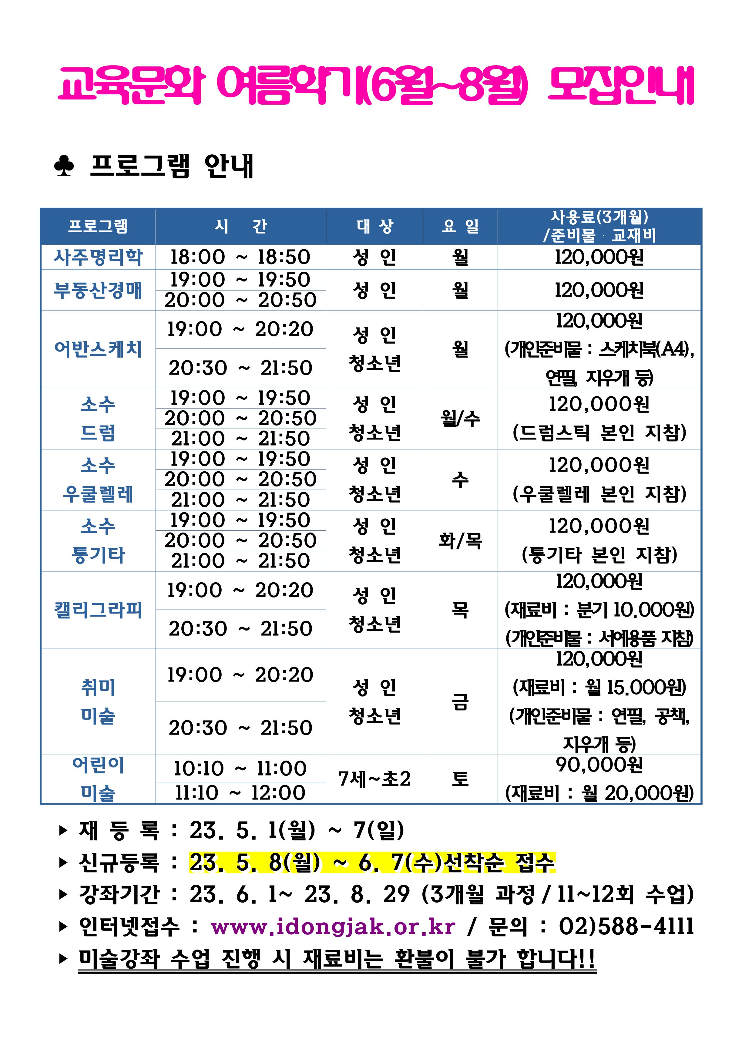 사당문화회관 사당문화회관 교육문화 여름학기(6~8월) 프로그램 안내 작성자 동작구민체육센터 작성일 2023년 4월 24일 16시 22분 22초 조회 699 2023 여름학기 홍보물(a0)최종.jpg [ Size : 772.48KB , Down : 710 ] 미리보기 다운로드 목록보기