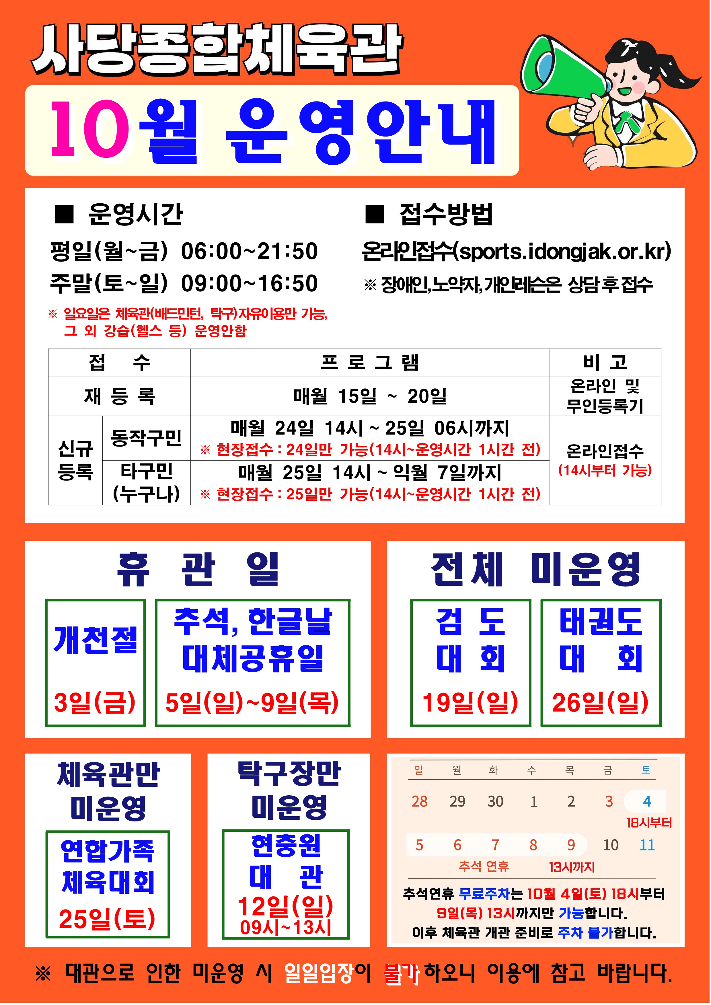사당종합체육관 사당종합체육관 10월 운영 및 휴관안내 작성자 동작구민체육센터 작성일 2025년 9월 29일 15시 2분 48초 조회 653 10월운영안내_1.jpg [ Size : 1.18MB , Down : 691 ] 미리보기 다운로드 목록보기