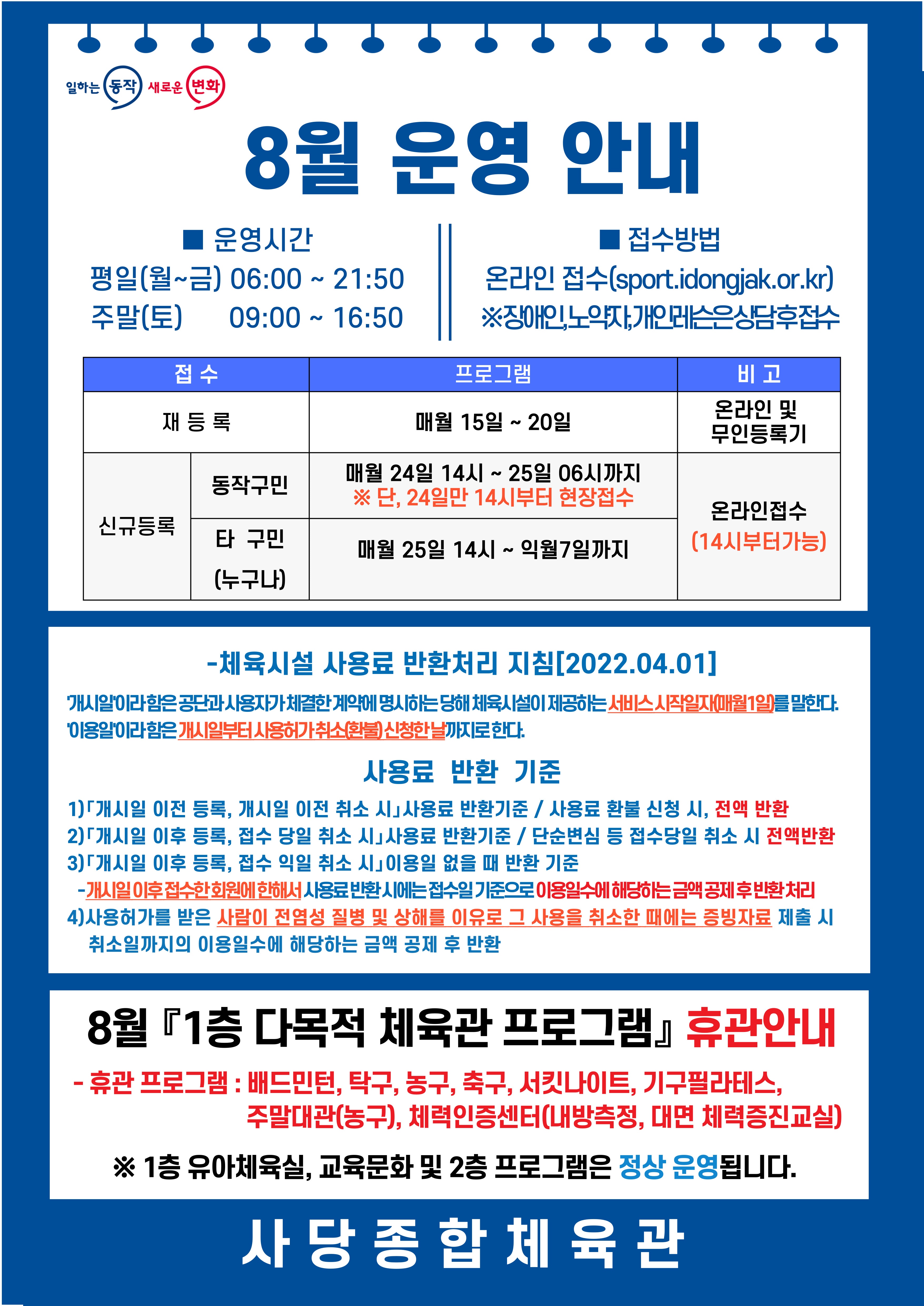 사당종합체육관 사당종합체육관 8월 휴관 및 운영안내 작성자 동작구민체육센터 작성일 2024년 7월 30일 15시 43분 9초 조회 676 8월 운영 안내 (최종).jpg [ Size : 2.19MB , Down : 238 ] 미리보기 다운로드 목록보기