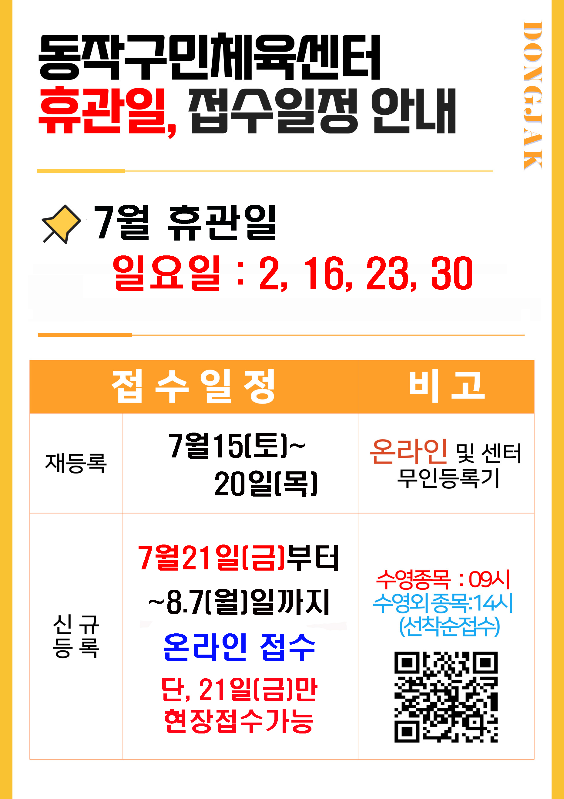 동작구민체육센터 동작구민체육센터 7월 휴관일 및 8월 접수 안내 작성자 동작구민체육센터 작성일 2023년 6월 29일 14시 15분 55초 조회 1,443 7월 접수일정(2023).JPG [ Size : 1.15MB , Down : 1,645 ] 미리보기 다운로드 목록보기