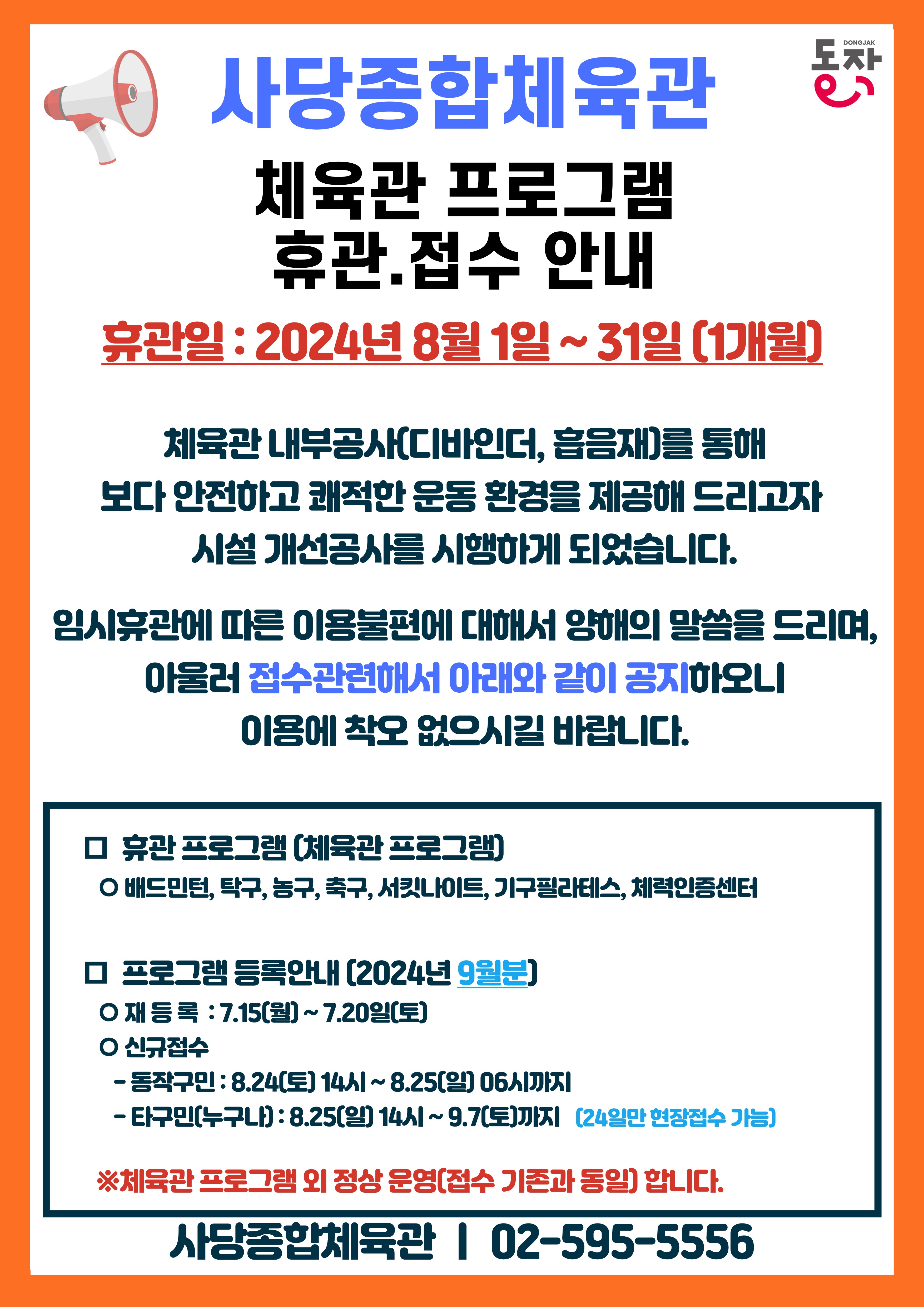 사당종합체육관 사당종합체육관 8월 체육관 프로그램 휴관 및 접수 안내 작성자 동작구민체육센터 작성일 2024년 7월 12일 15시 7분 49초 조회 716 체육관 프로그램 휴관 접수 안내 (최종).jpg [ Size : 1.75MB , Down : 206 ] 미리보기 다운로드 목록보기