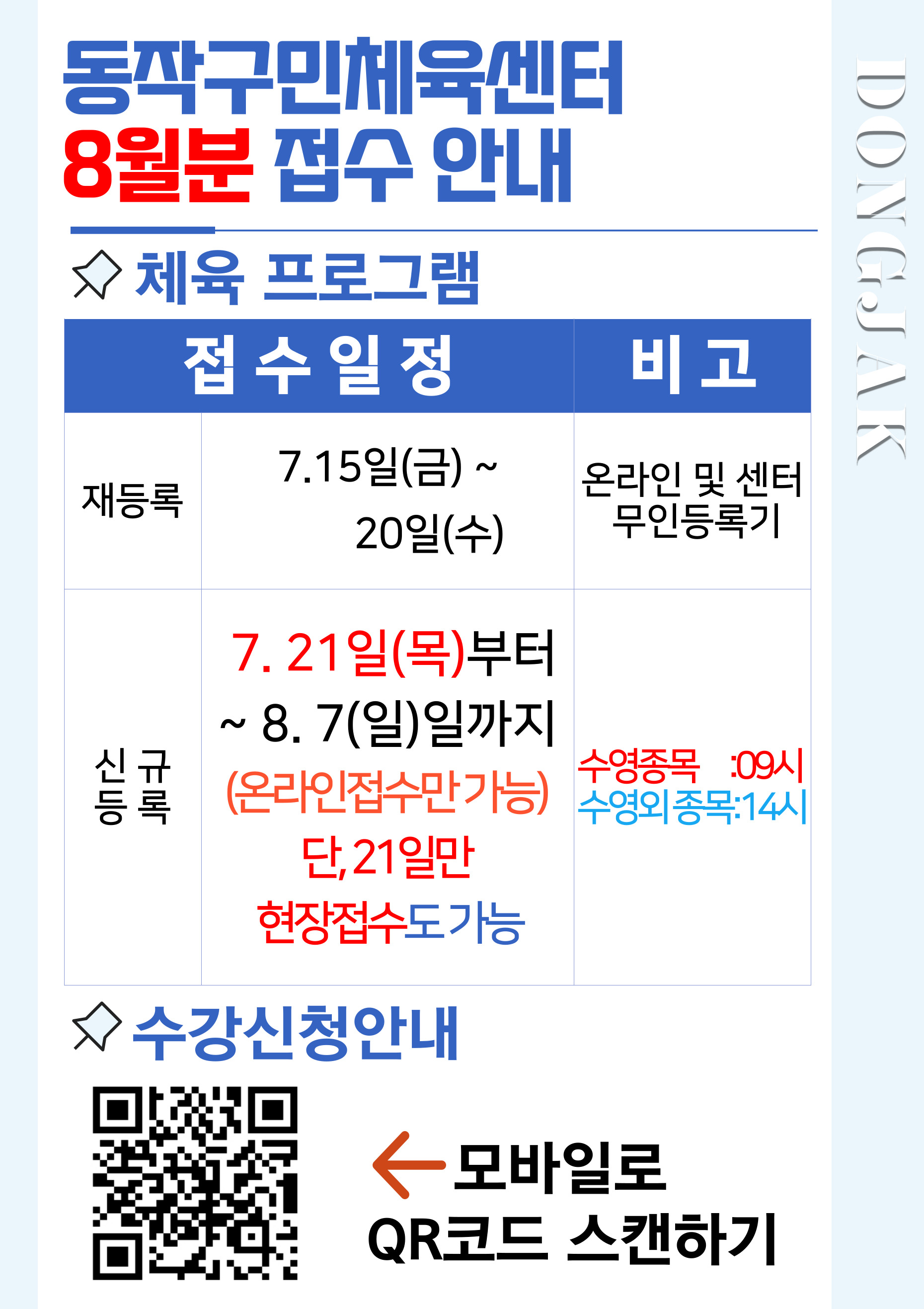 동작구민체육센터 동작구민체육센터 8월분 접수일정 안내 작성자 사당문화회관 작성일 2022년 7월 19일 15시 38분 7초 조회 1,409 8완성 !!!!.jpg [ Size : 536.28KB , Down : 1,278 ] 미리보기 다운로드 목록보기