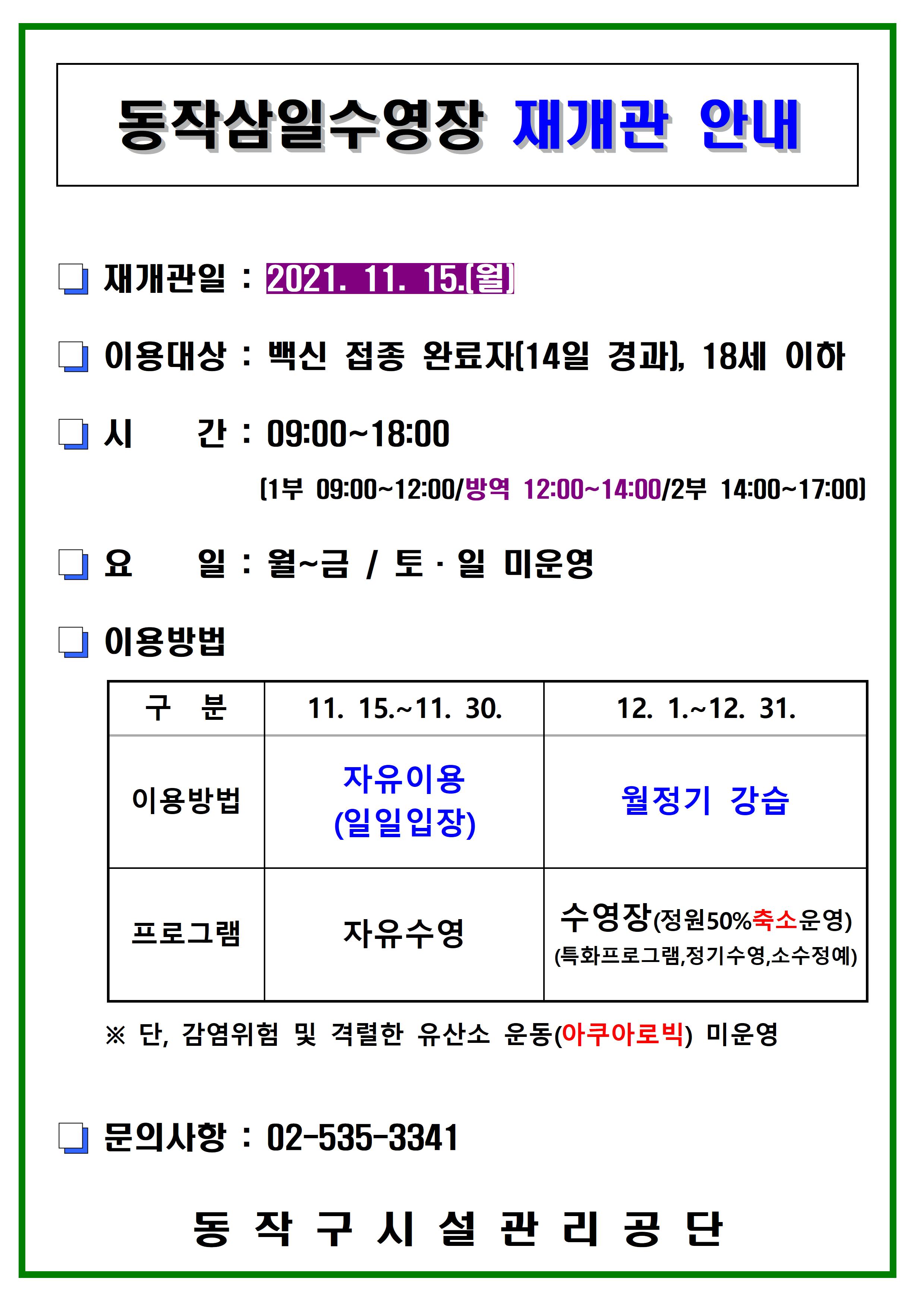삼일수영장 동작삼일수영장 11월 재개관 운영 안내 작성자 사당문화회관 작성일 2021년 11월 3일 17시 33분 32초 조회 1,272 체육시설 재개관 및 접수 안내문 삼일수영장001.jpg [ Size : 528.72KB , Down : 1,453 ] 미리보기 다운로드 목록보기
