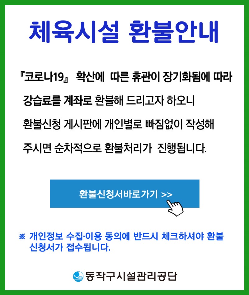 전체 환불신청안내 작성자 삼일수영장 작성일 2020년 8월 19일 15시 31분 47초 조회 1,903 20200729173144_900ab5f5c58668472e1b7920d2919b18_lw8j.jpg [ Size : 172.97KB , Down : 2,297 ] 미리보기 다운로드 목록보기