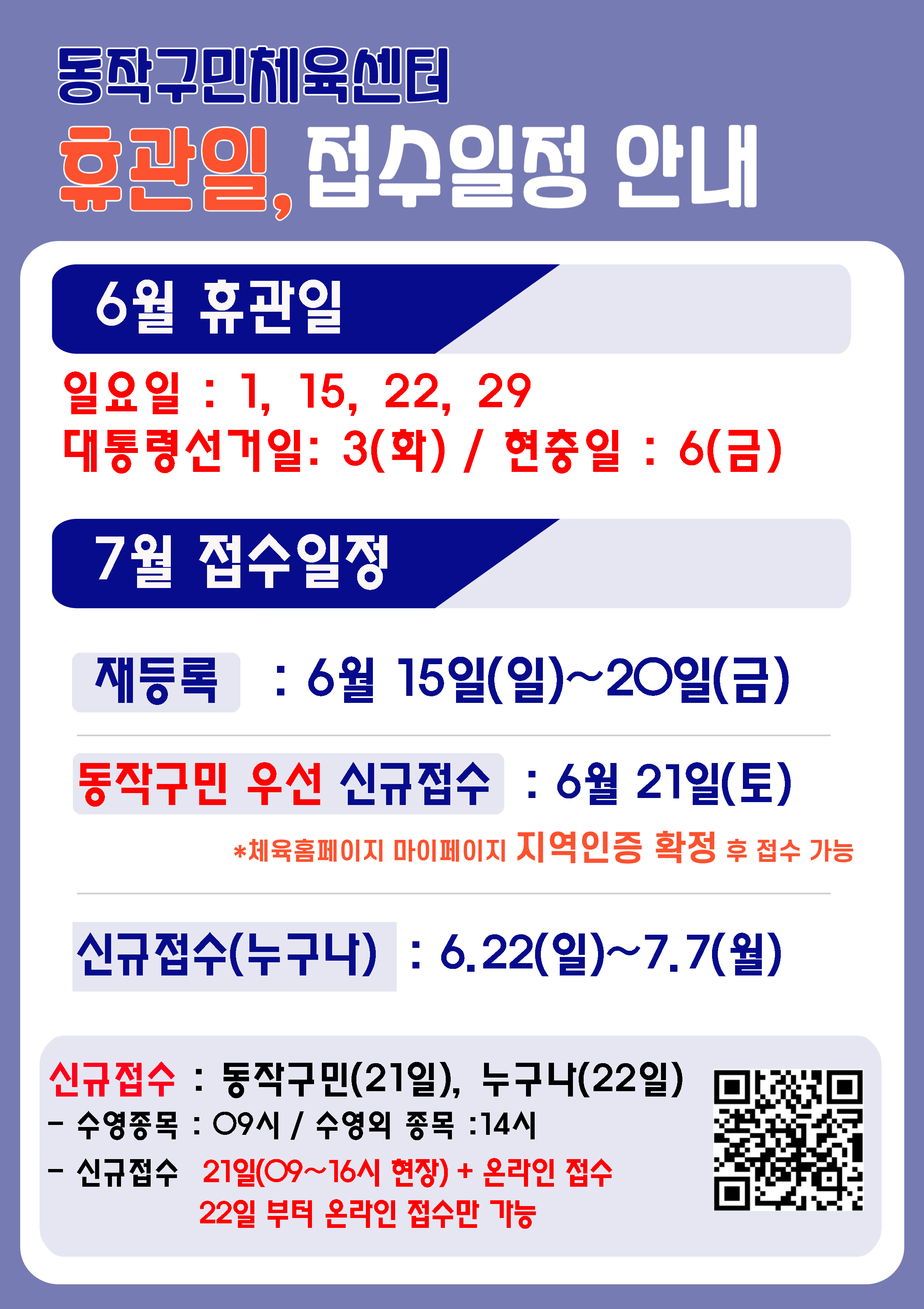 동작구민체육센터 동작구민체육센터 6월 휴관안내 및 7월 접수일정안내 작성자 동작구민체육센터 작성일 2025년 5월 29일 14시 48분 18초 조회 1,293 휴관일안내25.06.JPG [ Size : 1.8MB , Down : 244 ] 미리보기 다운로드 목록보기