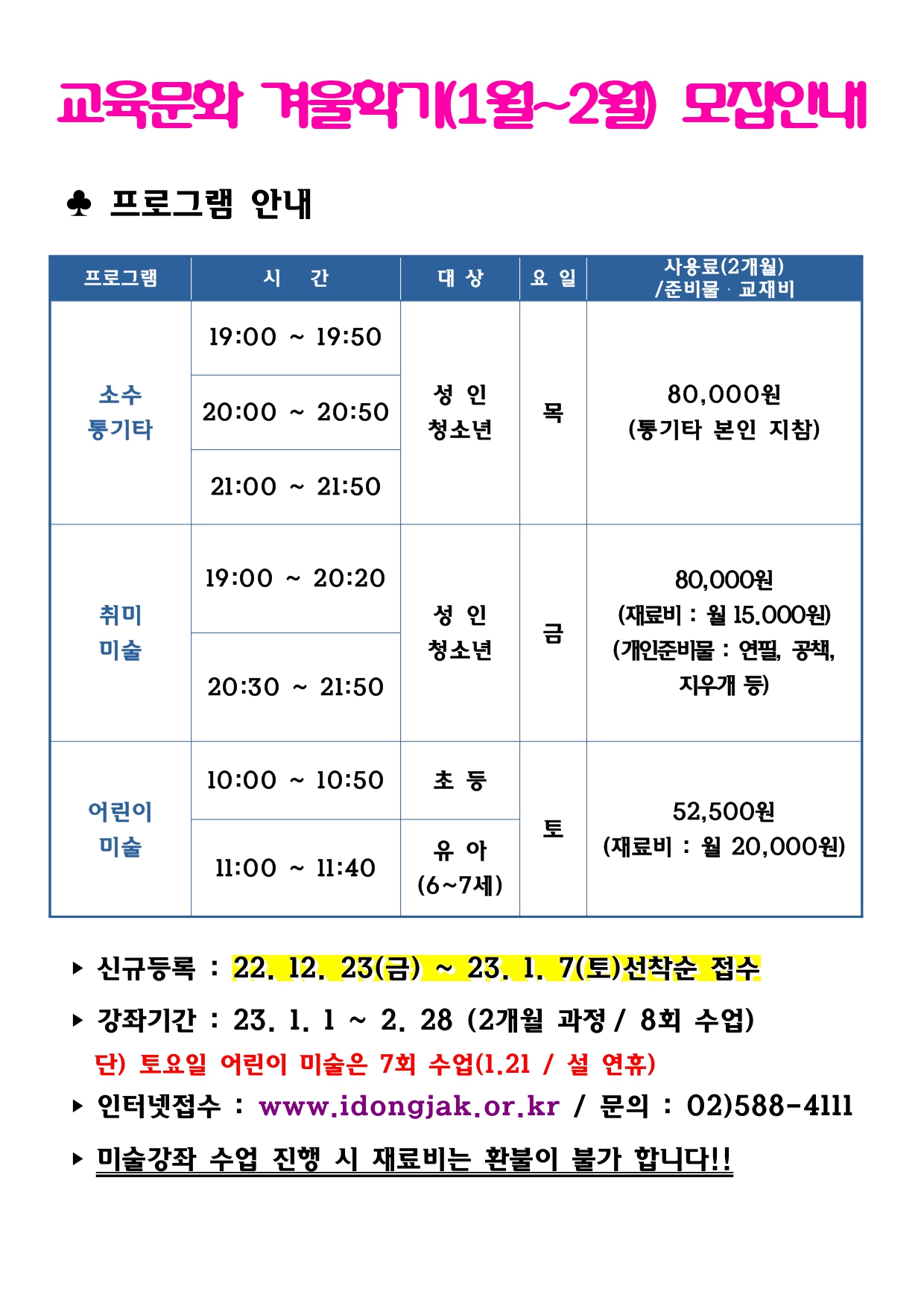 사당문화회관 사당문화회관 교육문화 겨울학기 2개월 과정(1~2월) 회원모집 및 프로그램 안내 작성자 동작구민체육센터 작성일 2022년 12월 9일 16시 13분 49초 조회 840 교육문화 2개월 과정.jpg [ Size : 538.24KB , Down : 313 ] 미리보기 다운로드 목록보기
