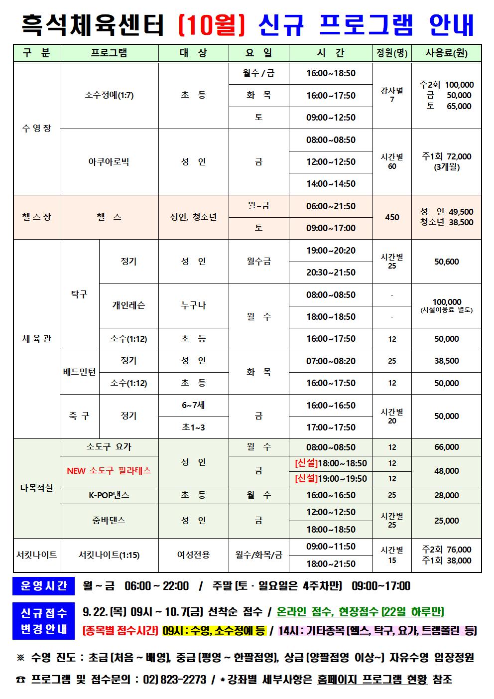 흑석체육센터 흑석체육센터 (10월) 신규 프로그램 안내 작성자 흑석체육문화센터 작성일 2022년 9월 14일 13시 22분 55초 조회 993 10월 프로그램 안내(흑석)신규 변경001.jpg [ Size : 219.35KB , Down : 473 ] 미리보기 다운로드 목록보기