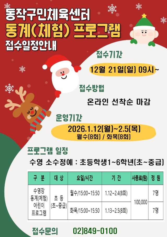 동작구민체육센터 동작구민체육센터 수영 동계(체험)프로그램 접수안내 작성자 동작구민체육센터 작성일 2025년 12월 10일 9시 24분 48초 조회 552 20251210_092416.jpg [ Size : 310.78KB , Down : 336 ] 미리보기 다운로드 목록보기