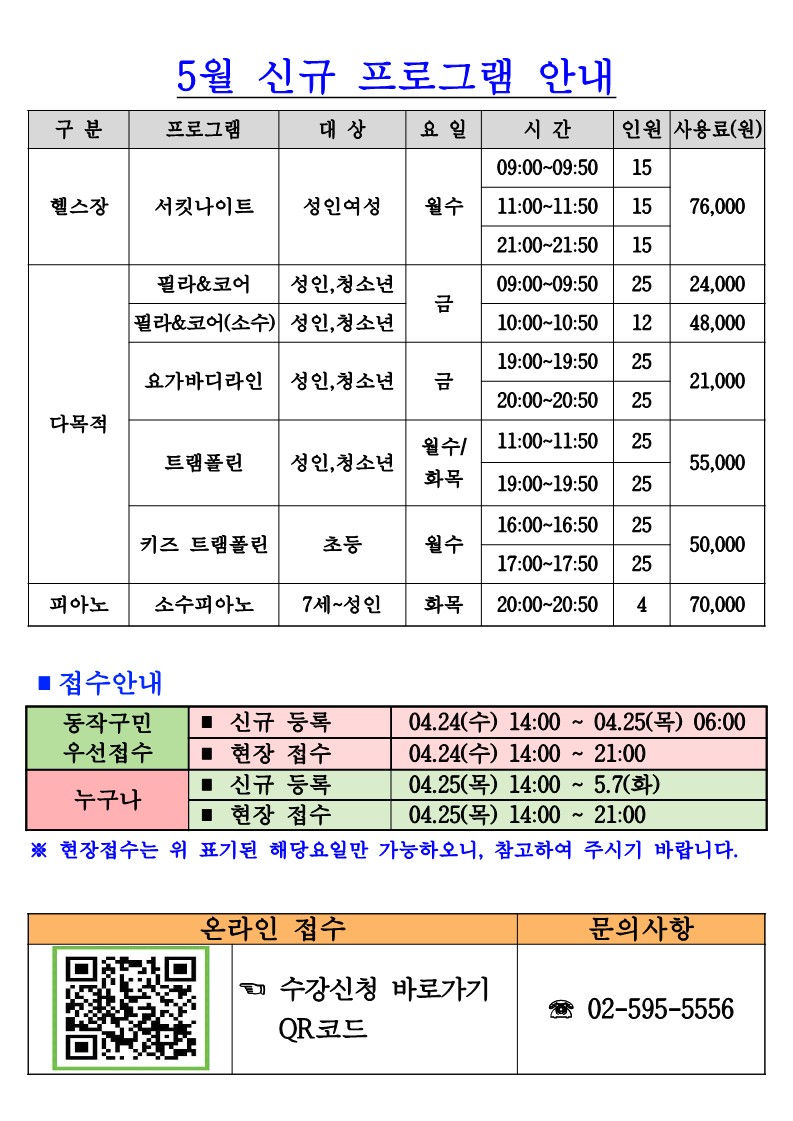 사당종합체육관 사당종합체육관 5월 신규프로그램 모집 작성자 동작구민체육센터 작성일 2024년 4월 17일 11시 6분 28초 조회 684 5월 신규 프로그램(수정)_1.jpg [ Size : 200.11KB , Down : 334 ] 미리보기 다운로드 목록보기