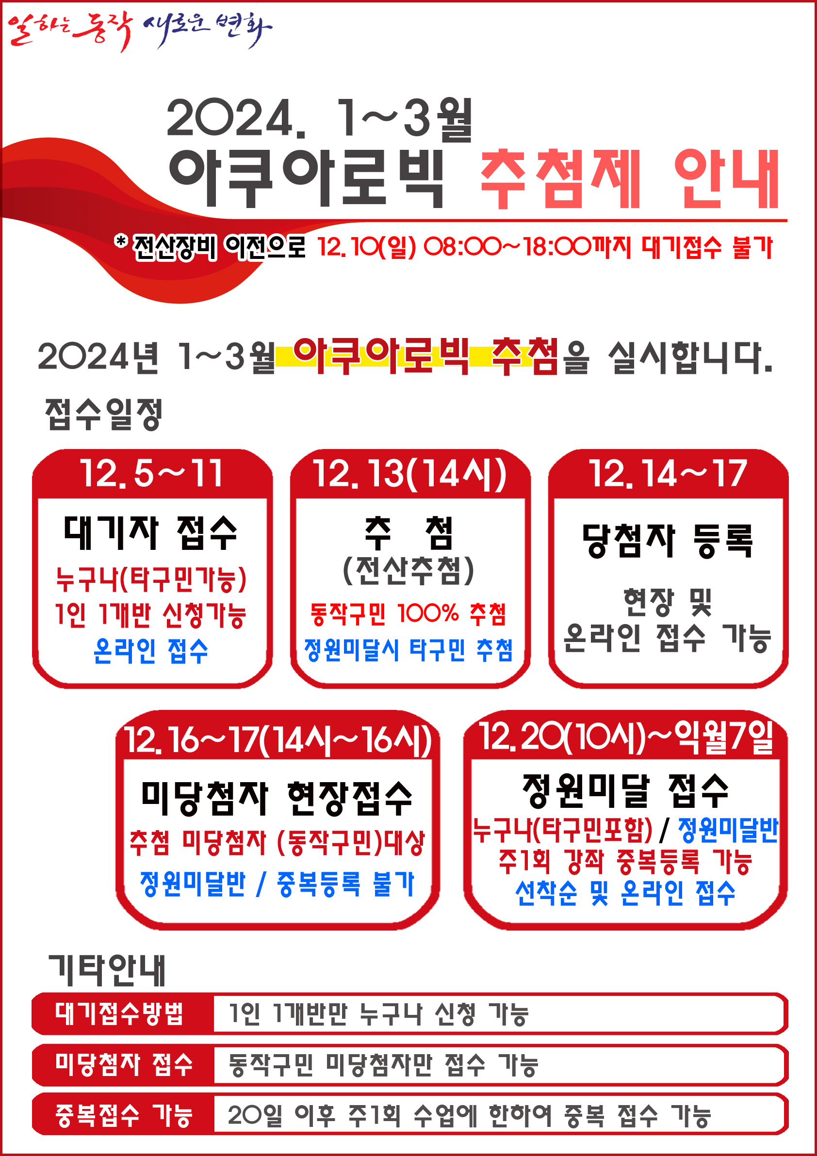 동작구민체육센터 동작구민체육센터 아쿠아로빅 2024.1~3월 추첨제 안내 작성자 동작구민체육센터 작성일 2023년 11월 28일 13시 23분 36초 조회 613 KakaoTalk_20231127_192734643.jpg [ Size : 1.5MB , Down : 340 ] 미리보기 다운로드 목록보기