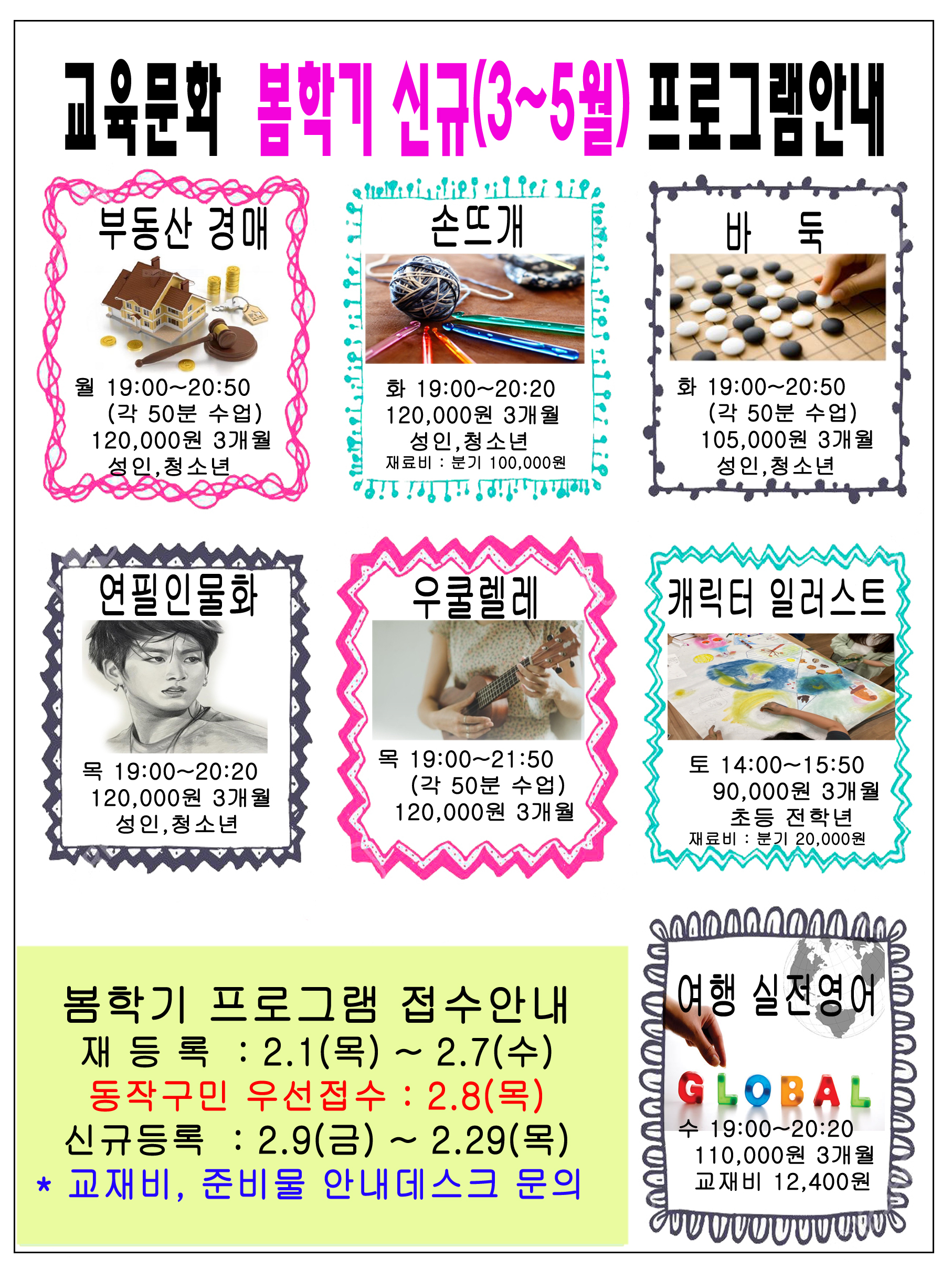 사당문화회관 사당문화회관 봄학기 교육문화(3~5월) 회원모집 안내 작성자 동작구민체육센터 작성일 2024년 2월 14일 8시 37분 34초 조회 679 봄학기 신규 최종.jpg [ Size : 1.99MB , Down : 379 ] 미리보기 다운로드 2024 봄학기 홍보물(a1)최종.jpg [ Size : 316.11KB , Down : 319 ] 미리보기 다운로드 목록보기