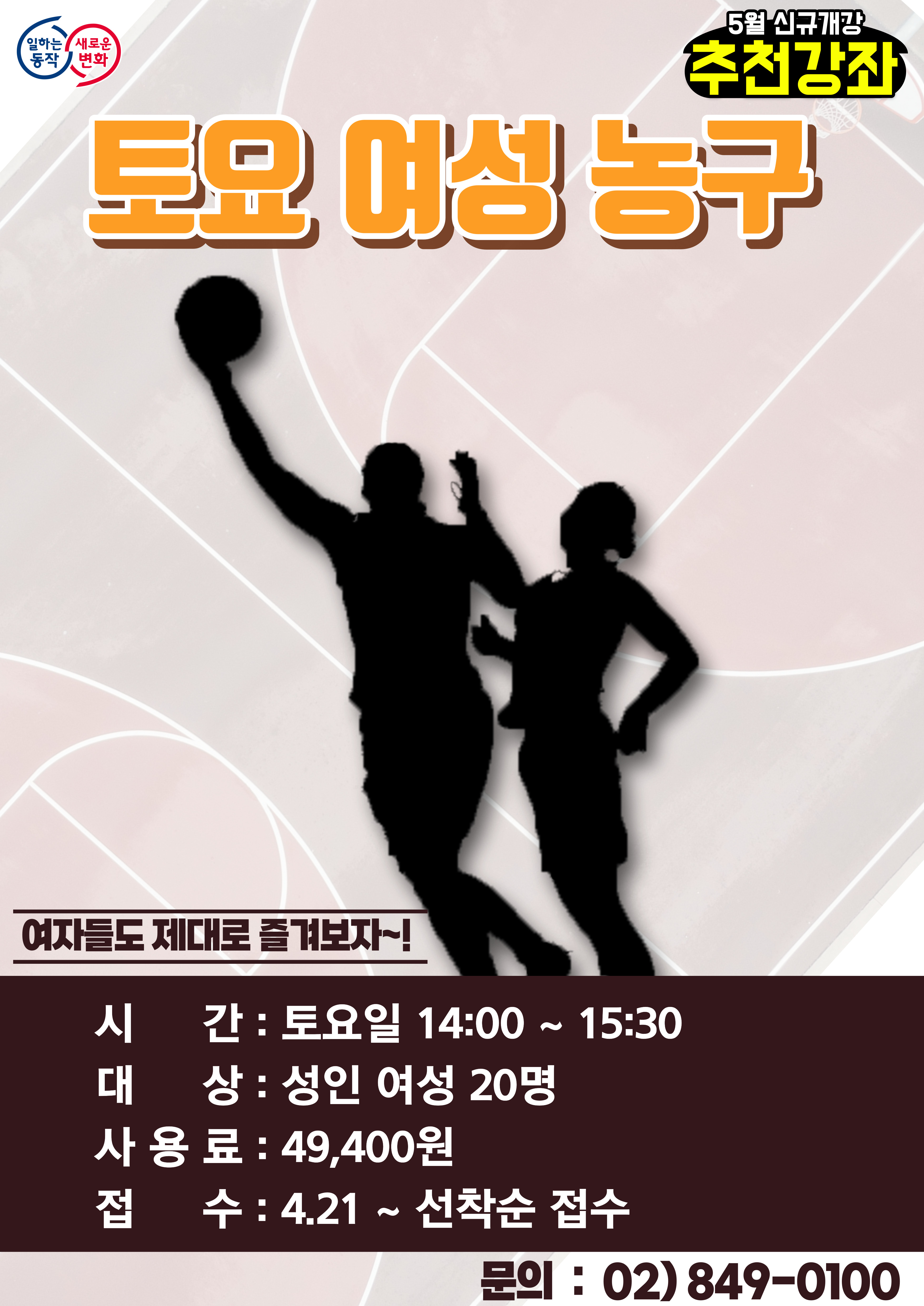 동작구민체육센터 동작구민체육센터 5월 토요 여성농구 프로그램 안내 작성자 사당문화회관 작성일 2023년 4월 13일 14시 53분 56초 조회 833 여성농구.jpg [ Size : 1.3MB , Down : 189 ] 미리보기 다운로드 목록보기