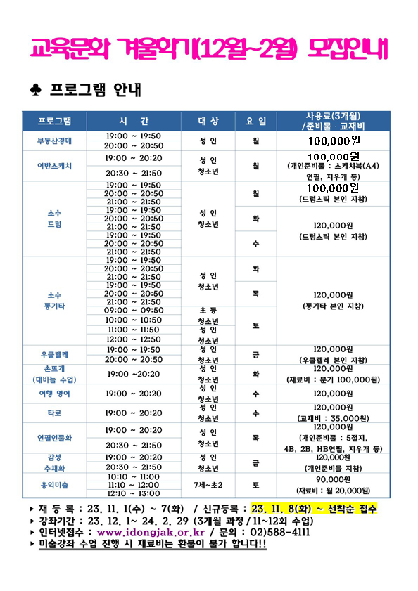 사당문화회관 사당문화회관 겨울학기 교육문화(12~2월) 회원모집 안내 작성자 사당문화회관 작성일 2023년 11월 22일 19시 37분 45초 조회 630 KakaoTalk_20231122_193143255.jpg [ Size : 320.32KB , Down : 299 ] 미리보기 다운로드 KakaoTalk_20231122_193143255_01.jpg [ Size : 278.66KB , Down : 296 ] 미리보기 다운로드 목록보기