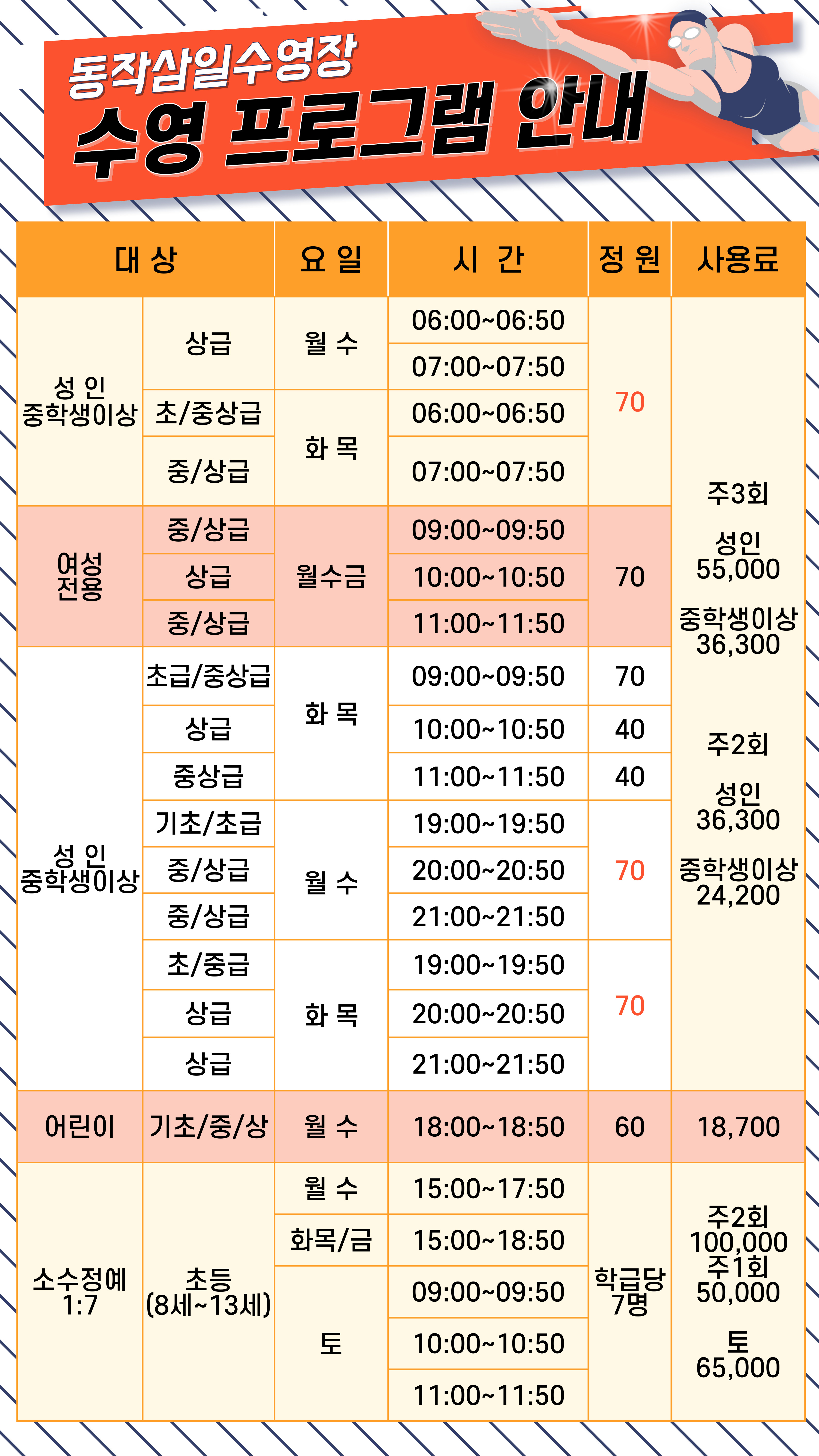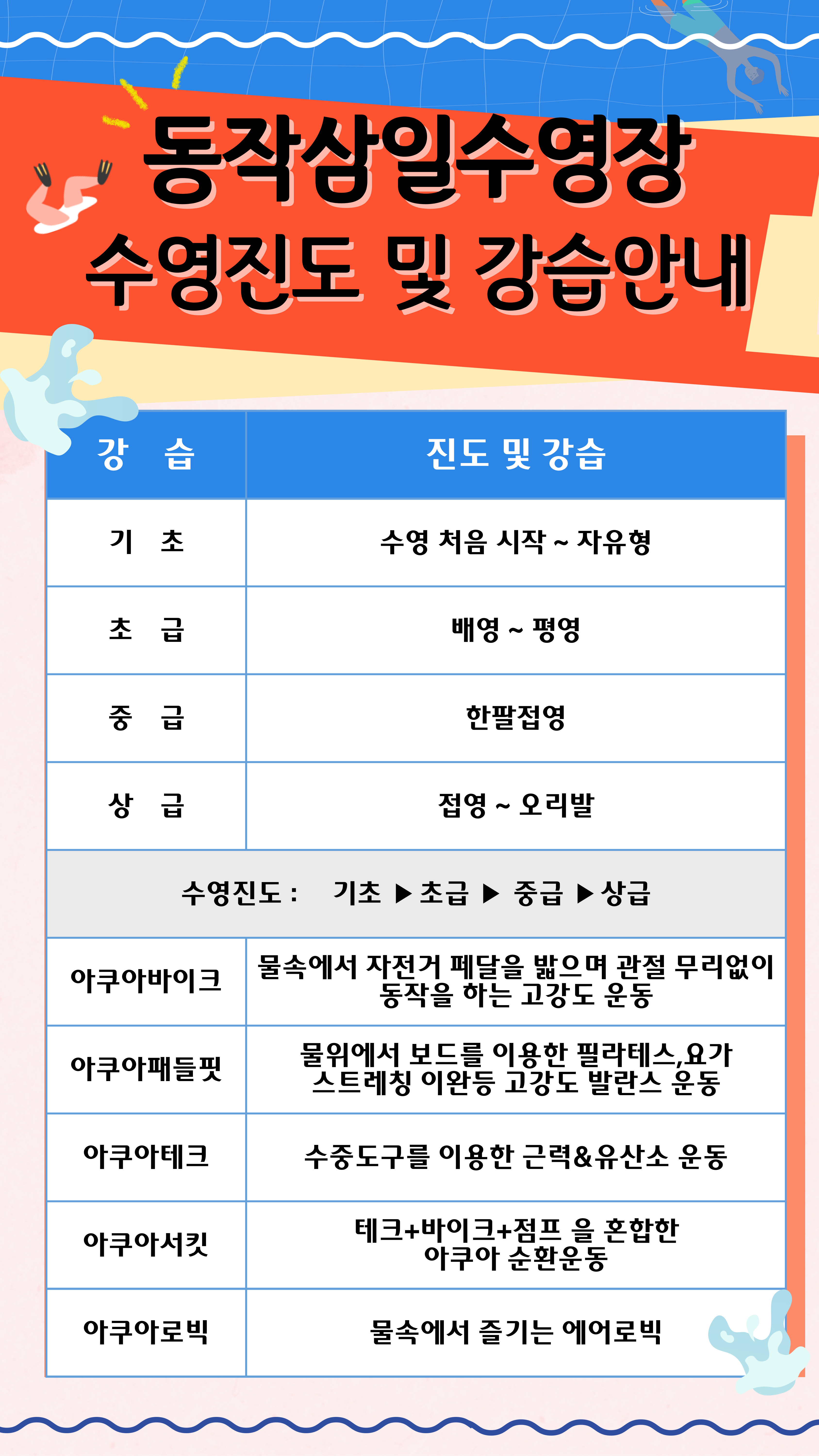 삼일수영장 동작삼일수영장 12월 정기수영 회원모집 안내 작성자 사당문화회관 작성일 2023년 11월 23일 13시 40분 43초 조회 669 2023년 12월 회원모집.jpg [ Size : 2.22MB , Down : 493 ] 미리보기 다운로드 수영-진도-!!-001 수정 23.10.23.jpg [ Size : 1.61MB , Down : 369 ] 미리보기 다운로드 목록보기