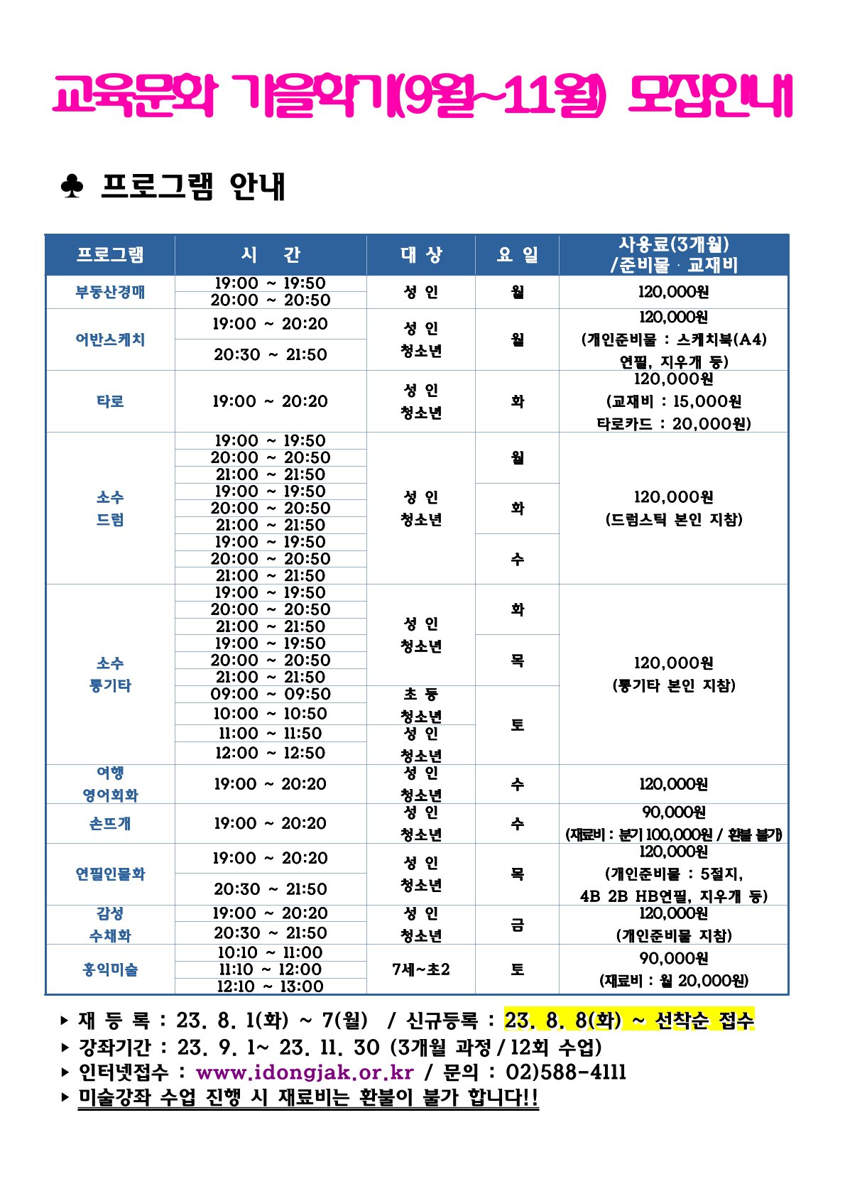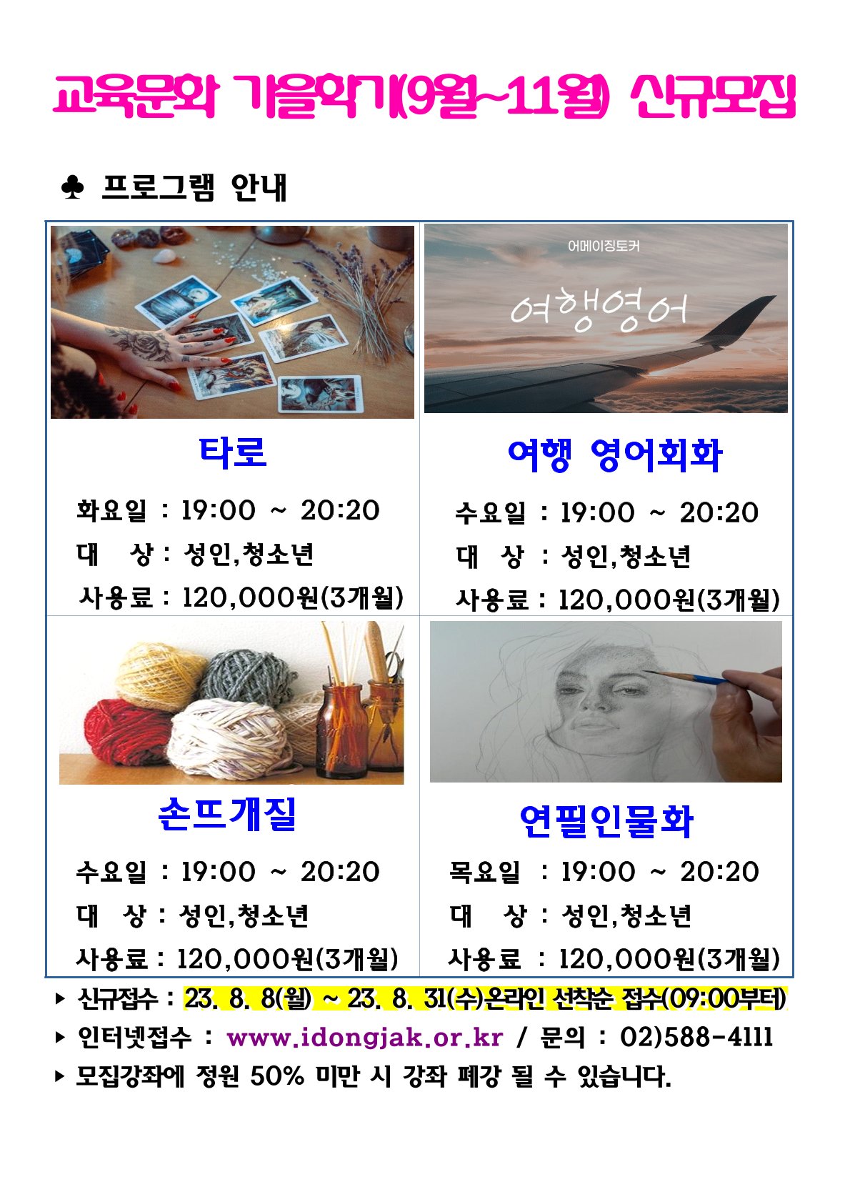 사당문화회관 사당문화회관 가을학기 교육문화(9~11월) 회원모집 안내 작성자 동작구민체육센터 작성일 2023년 7월 24일 15시 22분 2초 조회 679 교육문화 타로 수정버전 표.jpg [ Size : 309.42KB , Down : 264 ] 미리보기 다운로드 가을학기 교육문화홍보 4분할.jpg [ Size : 319.84KB , Down : 234 ] 미리보기 다운로드 목록보기