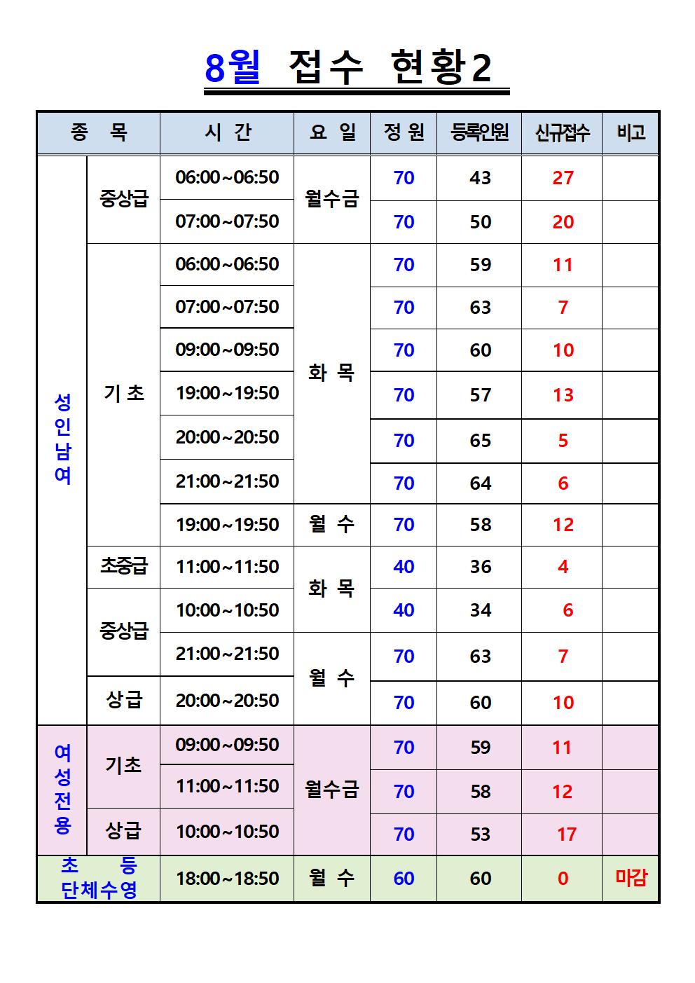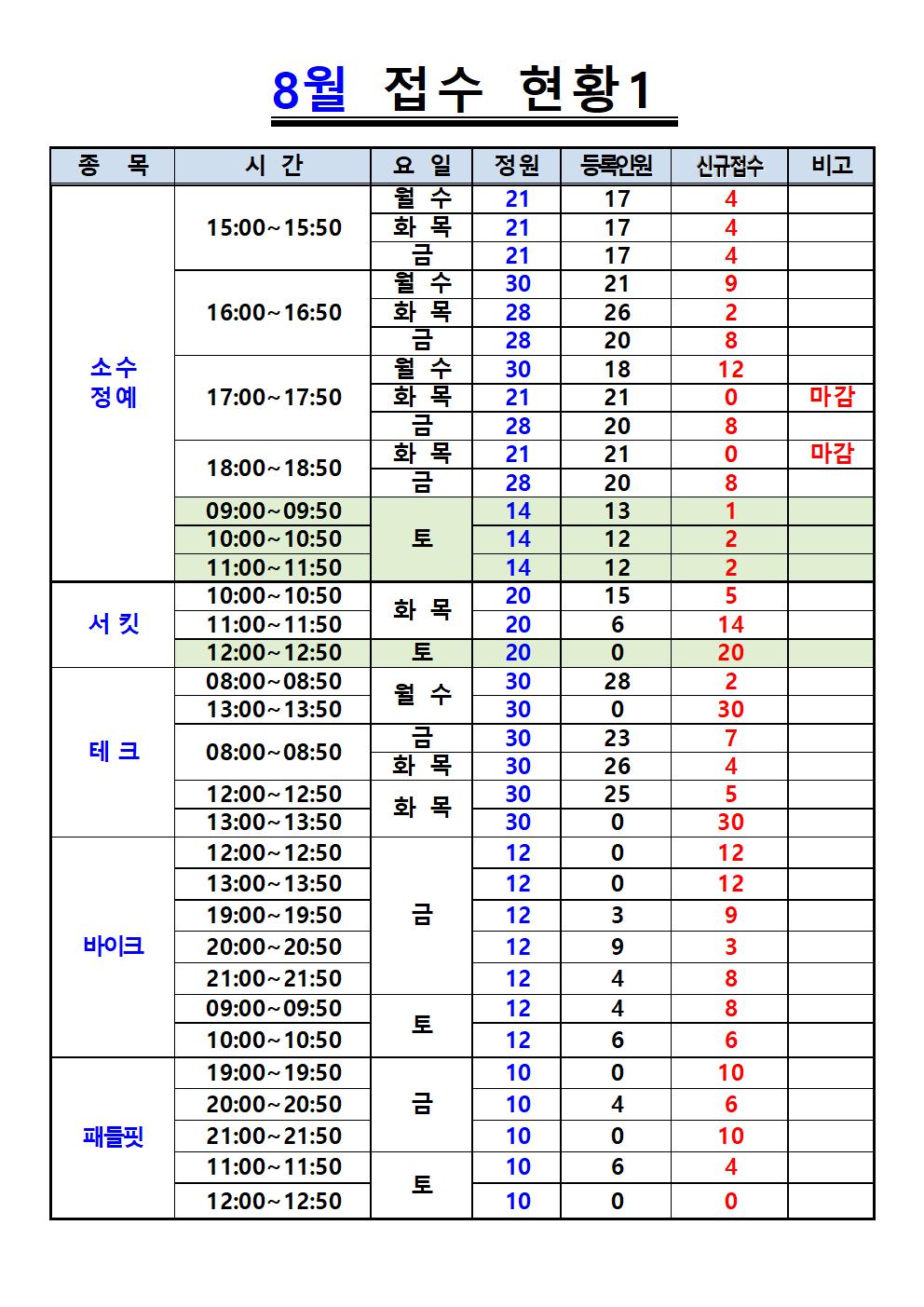 삼일수영장 8월 프로그램 및 접수현황 안내 작성자 사당문화회관 작성일 2022년 7월 23일 11시 0분 22초 조회 1,048 8월 접수현황1.jpg [ Size : 200.2KB , Down : 746 ] 미리보기 다운로드 8월 접수 현황2.jpg [ Size : 155.63KB , Down : 805 ] 미리보기 다운로드 목록보기