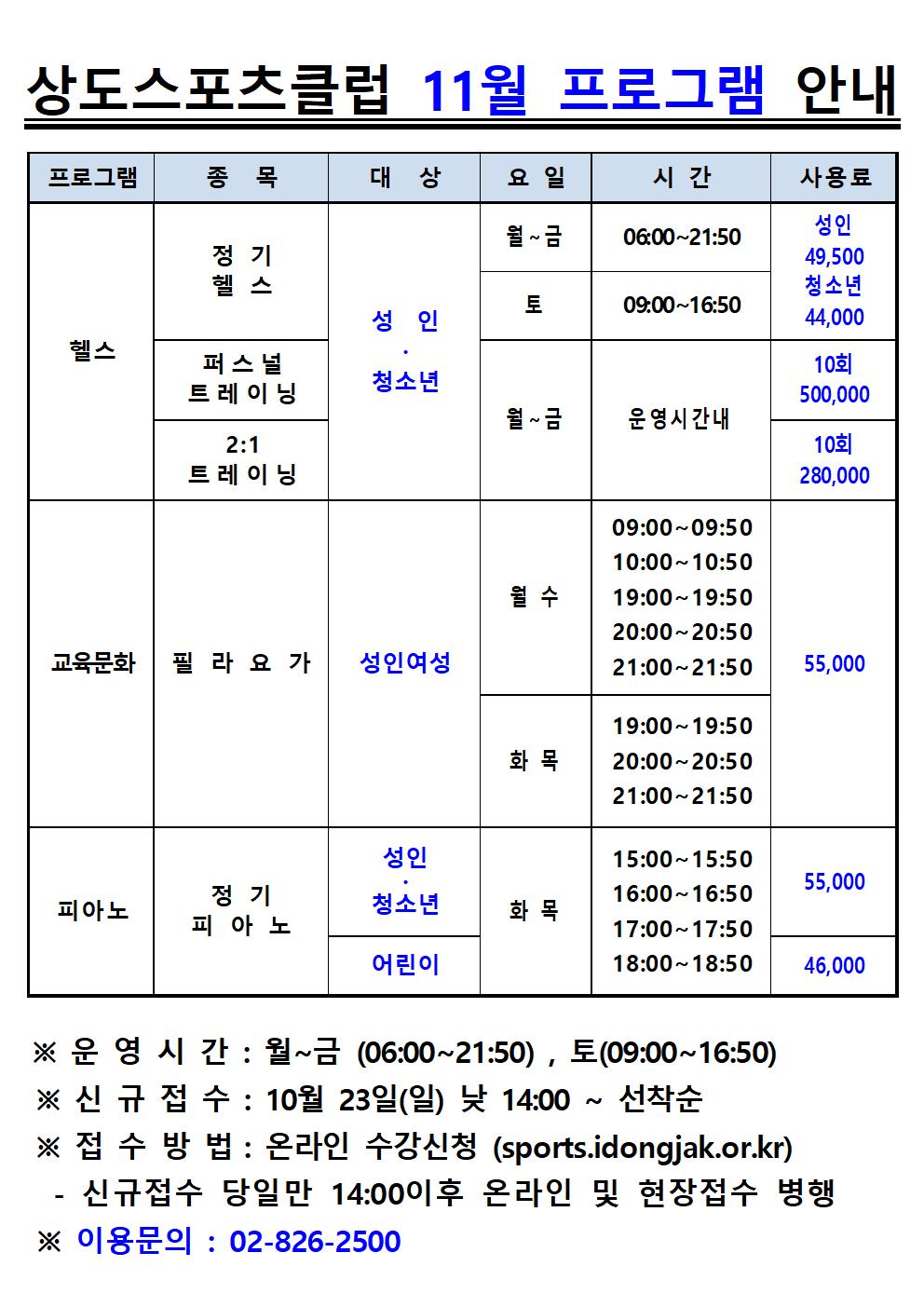 상도스포츠클럽 상도스포츠클럽 11월 프로그램 안내 작성자 상도스포츠클럽 작성일 2022년 10월 14일 13시 44분 20초 조회 859 11월프로그램안내(상도스포츠클럽)001.jpg [ Size : 172.59KB , Down : 394 ] 미리보기 다운로드 목록보기