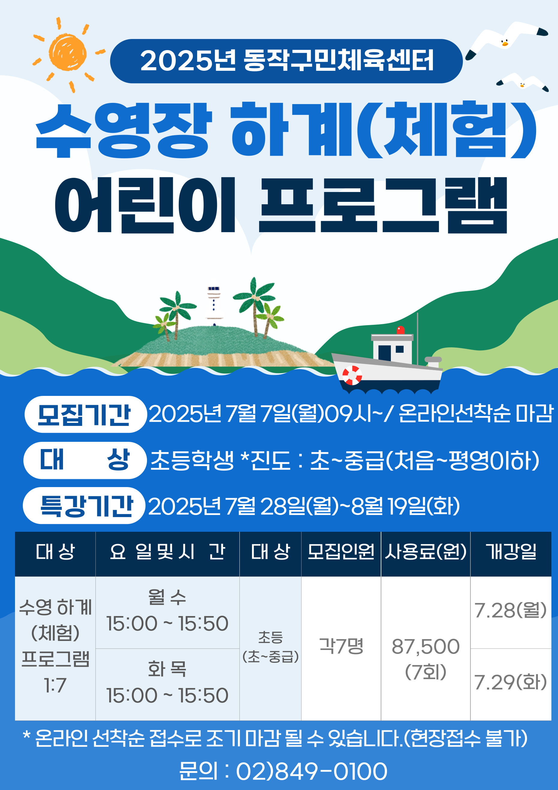 동작구민체육센터 동작구민체육센터 하계(체험) 어린이 프로그램 회원모집 작성자 동작구민체육센터 작성일 2025년 6월 28일 13시 5분 58초 조회 754 KakaoTalk_20250626_152143929.jpg [ Size : 740.69KB , Down : 134 ] 미리보기 다운로드 [접수기간]* 동작구민 : 2025. 7. 7.(월) 09시부터(온라인 선착순)* 누구나 : 2025. 7. 8.(화) 09시부터(온라인 선착순) 목록보기