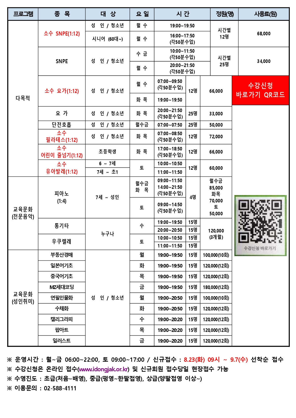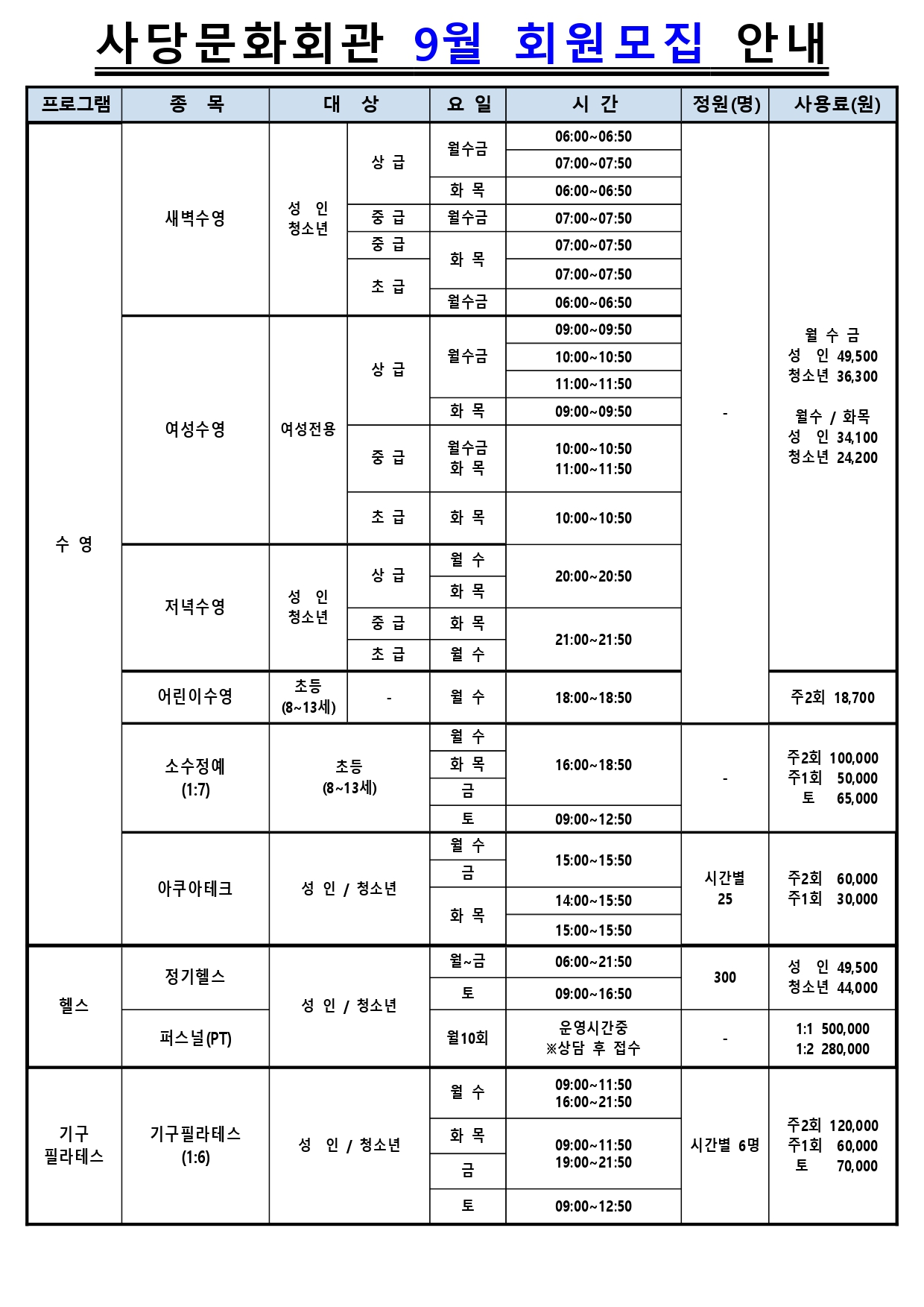 사당문화회관 사당문화회관 9월 프로그램 안내 작성자 사당문화회관 작성일 2022년 8월 17일 8시 52분 57초 조회 991 9월 회원모집 최종(교육문화수정)_page-0001.jpg [ Size : 492.52KB , Down : 553 ] 미리보기 다운로드 9월 회원모집 최종(교육문화수정)_page-0002.jpg [ Size : 704.65KB , Down : 518 ] 미리보기 다운로드 목록보기