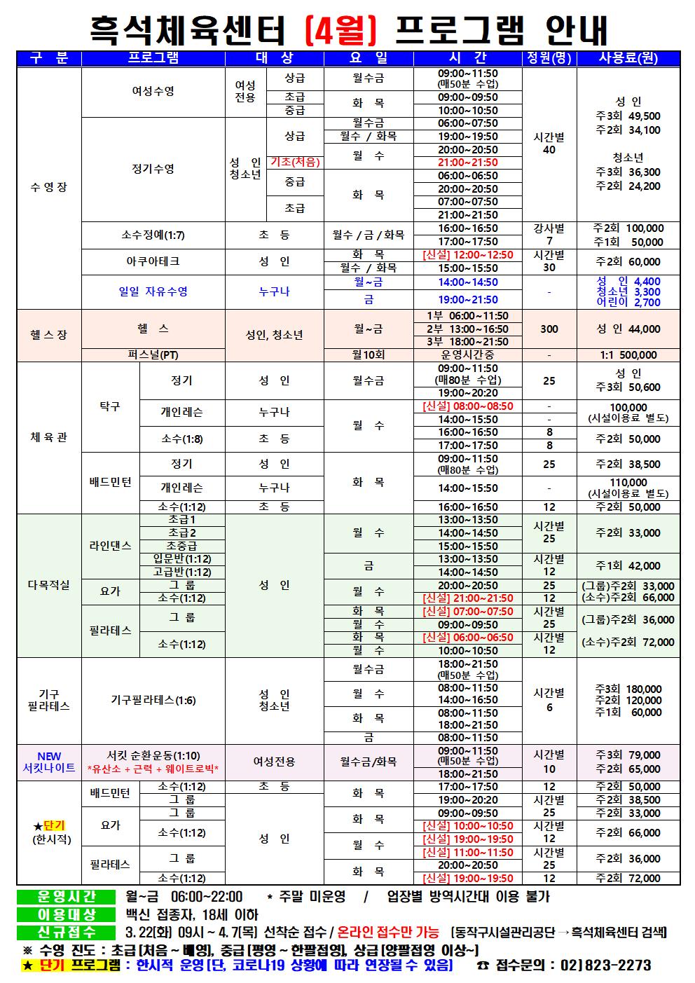 흑석체육센터 흑석체육센터 (4월) 프로그램 안내 작성자 흑석체육문화센터 작성일 2022년 3월 15일 17시 35분 30초 조회 1,085 4월 프로그램 안내(흑석) 필라추가001.jpg [ Size : 300.94KB , Down : 547 ] 미리보기 다운로드 목록보기