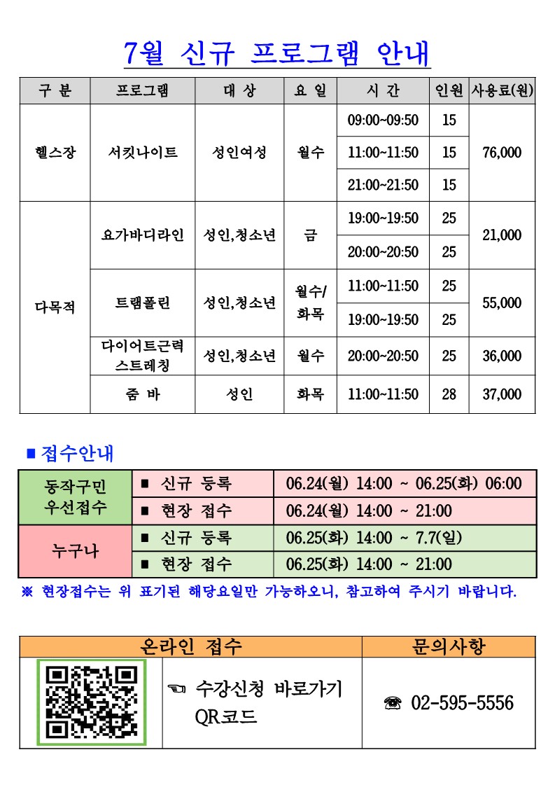 사당종합체육관 사당종합체육관 7월 신규프로그램 안내 작성자 동작구민체육센터 작성일 2024년 6월 14일 14시 8분 53초 조회 692 7월 신규 프로그램(수정)_1.jpg [ Size : 183.07KB , Down : 401 ] 미리보기 다운로드 목록보기