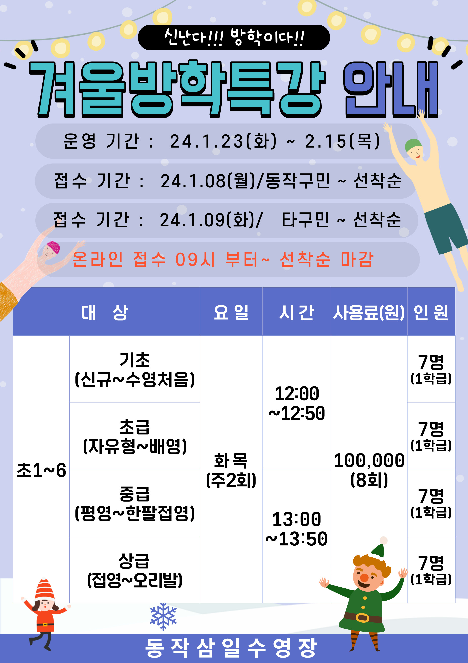 삼일수영장 동작삼일수영장 겨울방학특강 회원모집 안내 작성자 사당문화회관 작성일 2023년 12월 27일 10시 24분 25초 조회 737 방특2장 에이원.jpg [ Size : 642.37KB , Down : 381 ] 미리보기 다운로드 목록보기