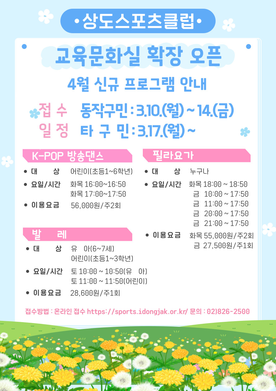 상도스포츠클럽 상도스포츠클럽 교육문화실 확장에 따른 신설 프로그램(방송댄스, 발레, 필라요가) 작성자 상도스포츠클럽 작성일 2025년 3월 4일 13시 47분 14초 조회 646 상도-교육문화실확장오픈-신규프로그램안내(A0x1장, A1x1)확정.jpg [ Size : 296.91KB , Down : 303 ] 미리보기 다운로드 목록보기