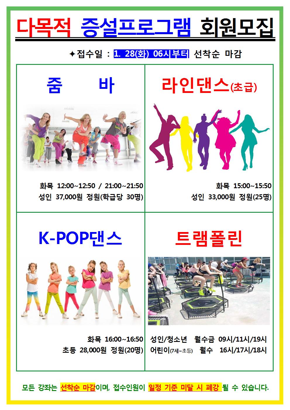 흑석체육센터 다목적 증설 프로그램 작성자 흑석체육문화센터 작성일 2020년 1월 14일 14시 31분 37초 조회 1,283 다목적 증설프로그램001.jpg [ Size : 208.74KB , Down : 808 ] 미리보기 다운로드 목록보기