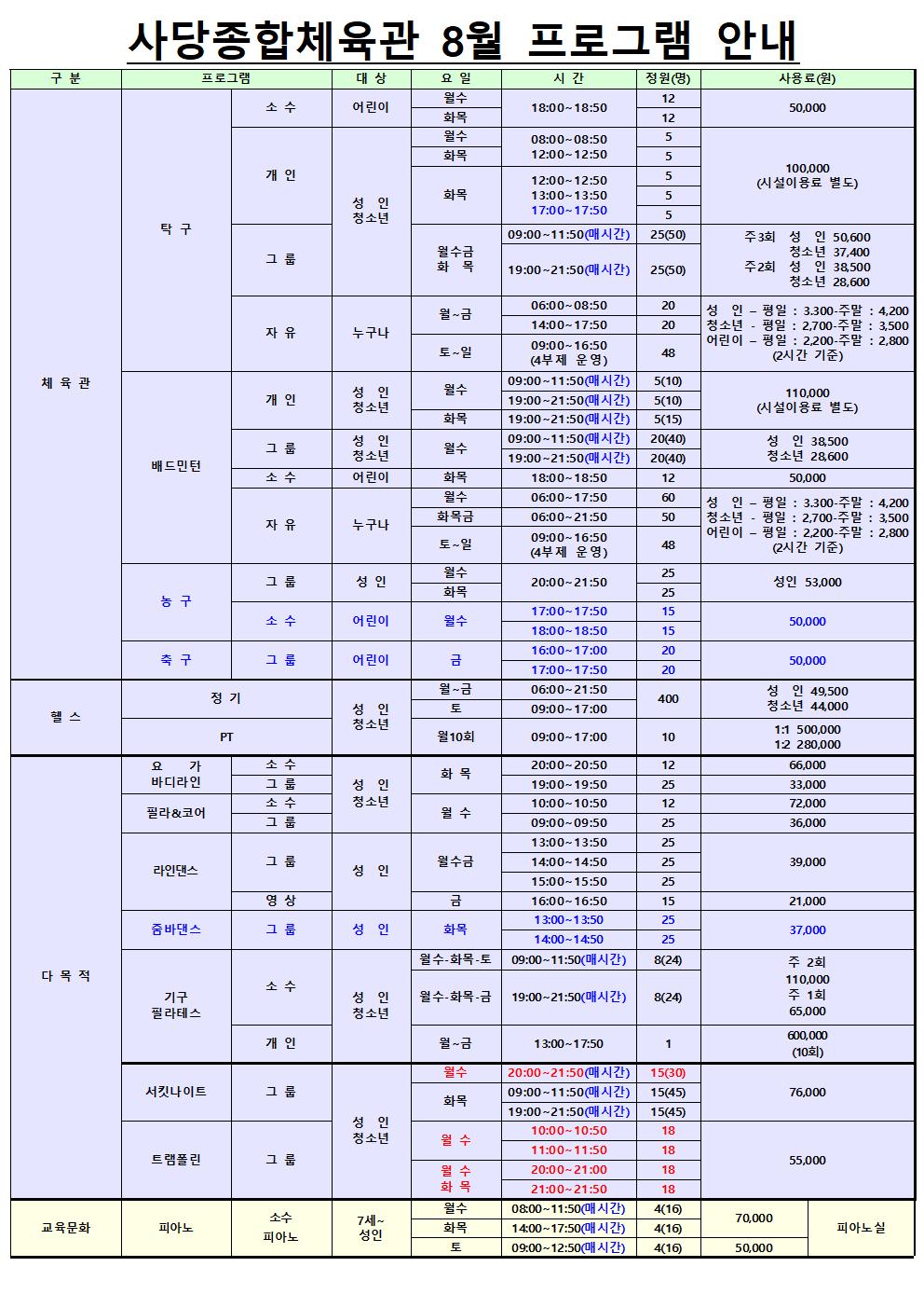 사당종합체육관 사당종합체육관 8월 프로그램 안내 작성자 동작구민체육센터 작성일 2022년 7월 29일 10시 44분 14초 조회 924 8월 프로그램 안내(내부출력용) 최종!001.jpg [ Size : 234.53KB , Down : 436 ] 미리보기 다운로드 목록보기