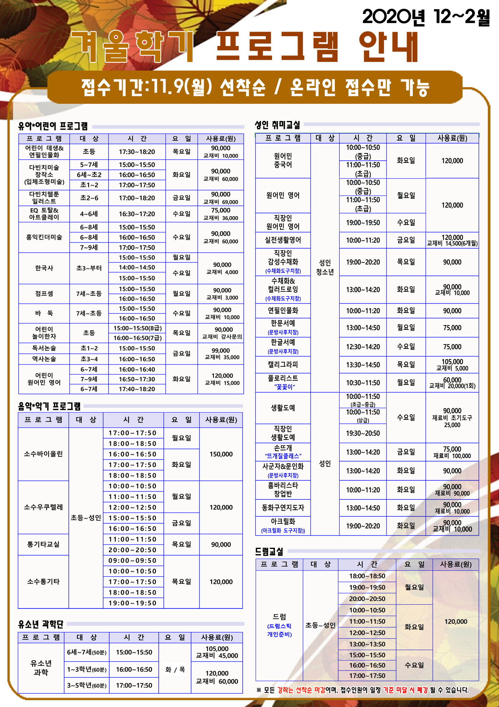 동작구민체육센터 동작구민체육센터 교육문화 겨울학기(12~2월) 회원모집 안내 작성자 동작구민체육센터 작성일 2020년 11월 6일 15시 7분 49초 조회 1,619 겨울학기 전체.jpg [ Size : 1.88MB , Down : 1,409 ] 미리보기 다운로드 목록보기