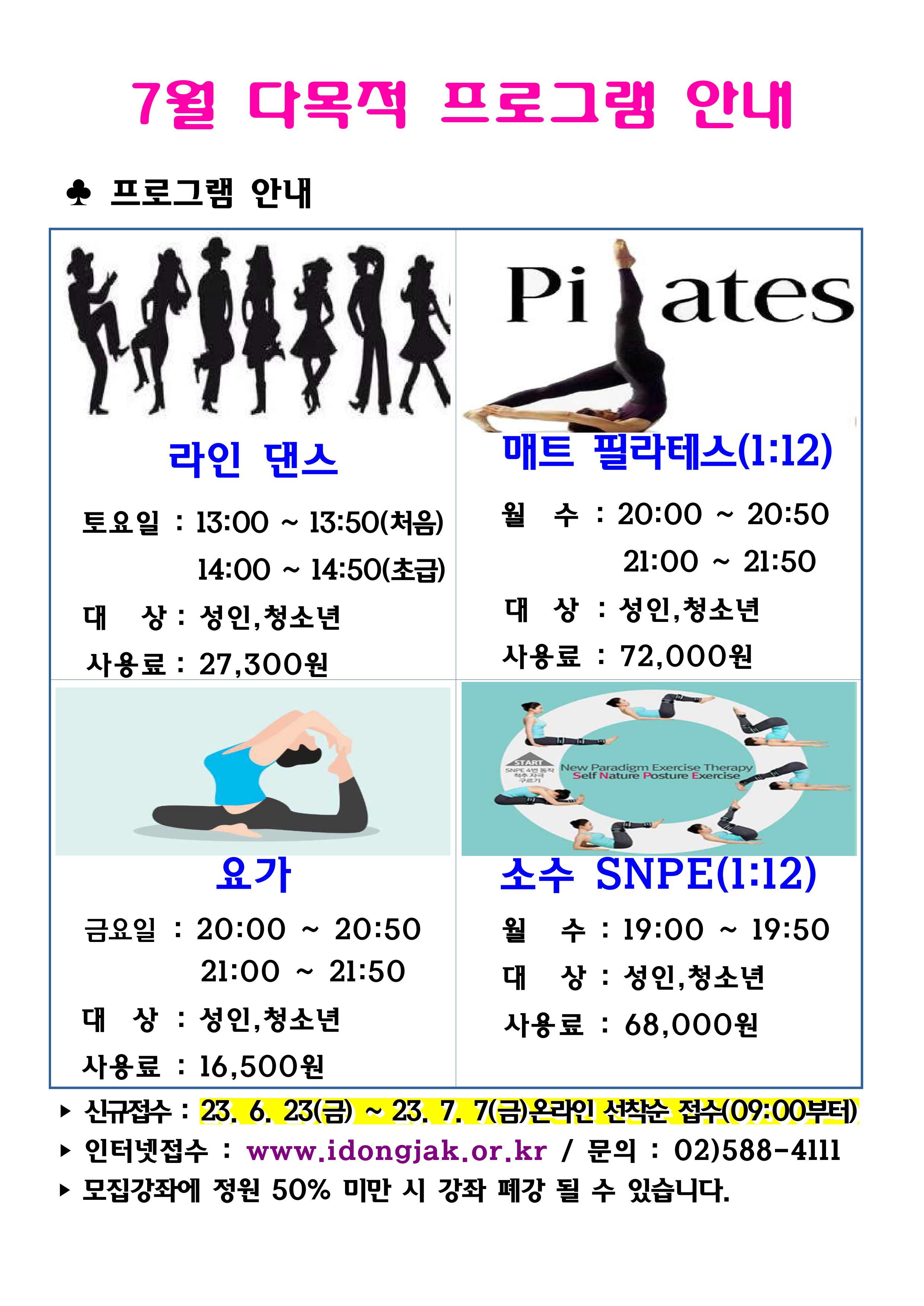 사당문화회관 사당문화회관 7월 다목적 프로그램 회원모집 안내 작성자 동작구민체육센터 작성일 2023년 6월 7일 13시 58분 2초 조회 663 7월 체육신규프로그램홍보 (1).jpg [ Size : 634.66KB , Down : 255 ] 미리보기 다운로드 목록보기