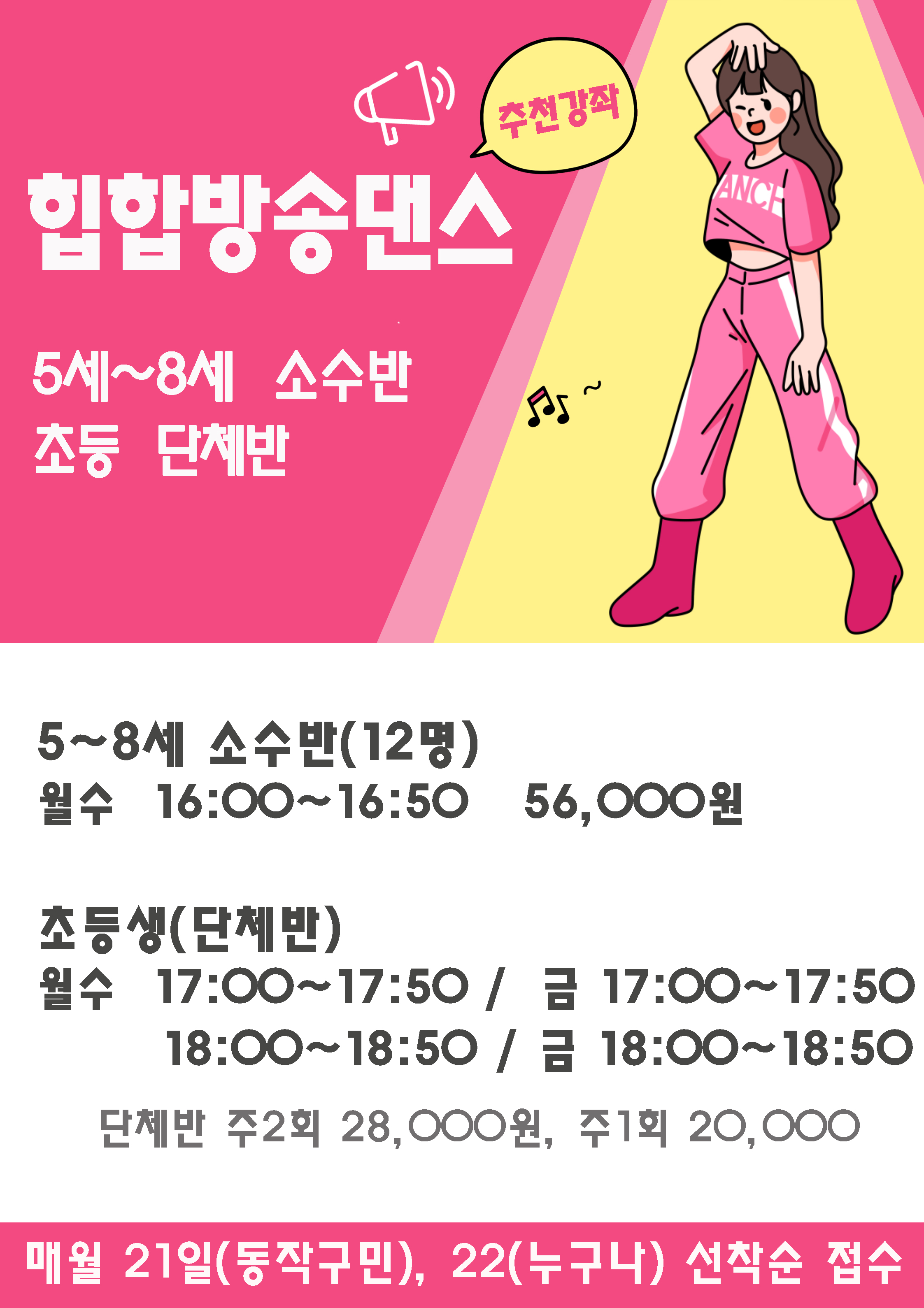 동작구민체육센터 동작구민체육센터 다목적실 유아, 어린이, 성인 추천강좌 작성자 동작구민체육센터 작성일 2023년 10월 17일 13시 11분 37초 조회 745 줄넘기 copy.JPG [ Size : 8.51MB , Down : 242 ] 미리보기 다운로드 힙합방송댄스.JPG [ Size : 8.67MB , Down : 282 ] 미리보기 다운로드 요가 copy.JPG [ Size : 504.75KB , Down : 181 ] 미리보기 다운로드 방송댄스 어린이 copy.JPG [ Size : 1.32MB , Down : 205 ] 미리보기 다운로드 목록보기