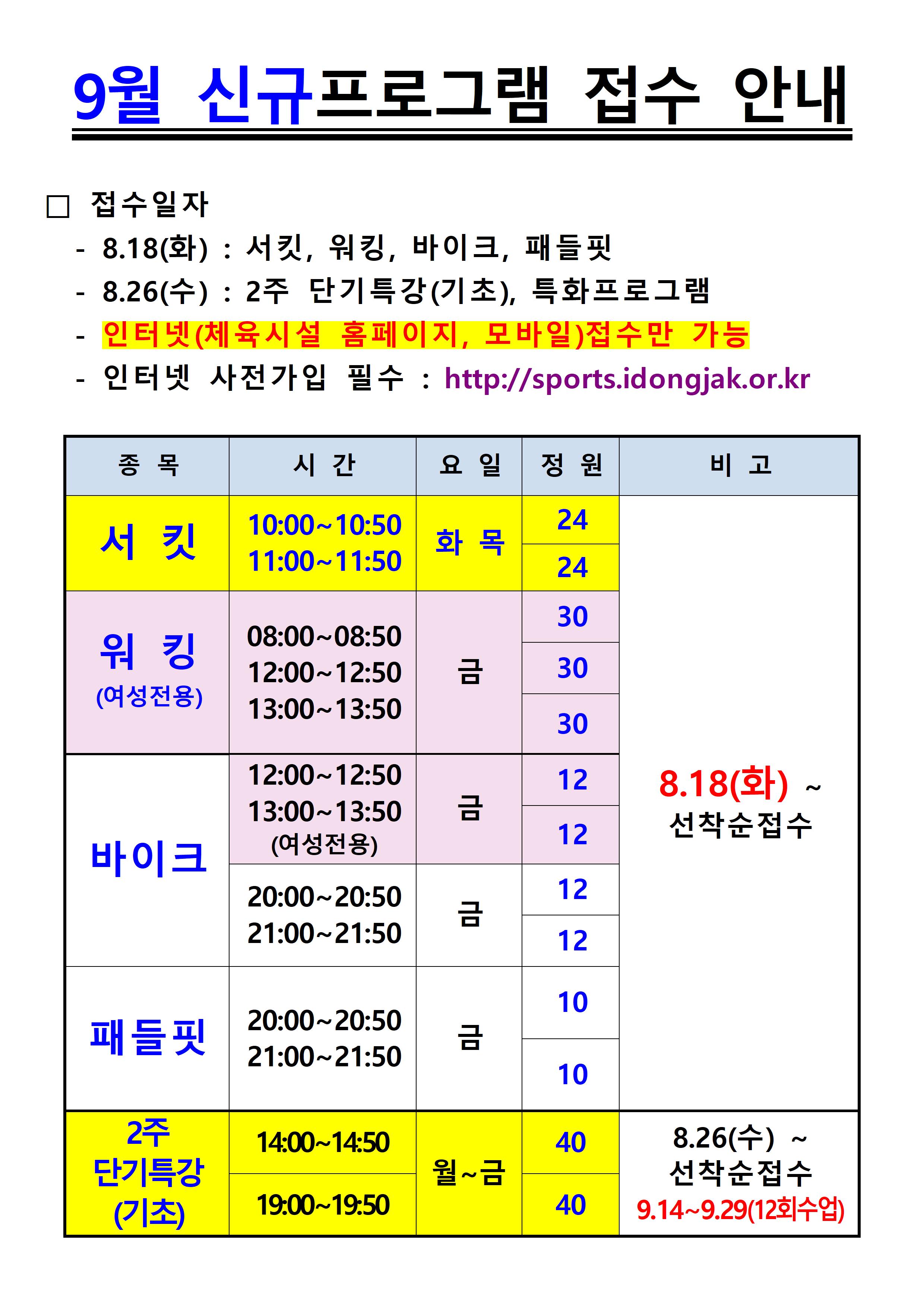 삼일수영장 동작삼일수영장 재개관 및 신규접수 안내(일정변경) 작성자 삼일수영장 작성일 2020년 8월 18일 15시 26분 45초 조회 1,371 4.재개관 접수안내(본부공지양식)수정001.jpg [ Size : 725.48KB , Down : 1,529 ] 미리보기 다운로드 9월 신규모집안내(0818수정)001.jpg [ Size : 594.75KB , Down : 1,258 ] 미리보기 다운로드 목록보기