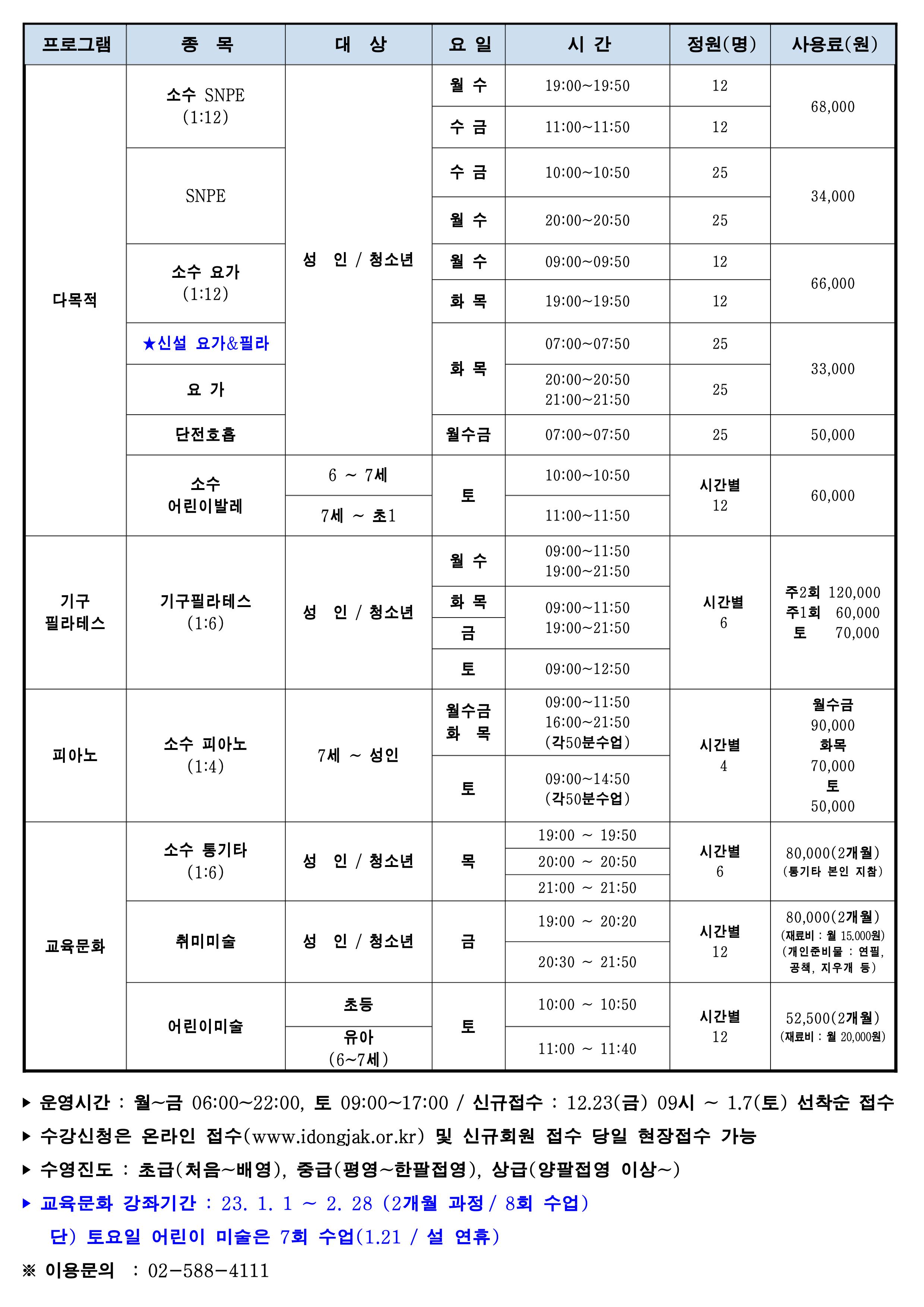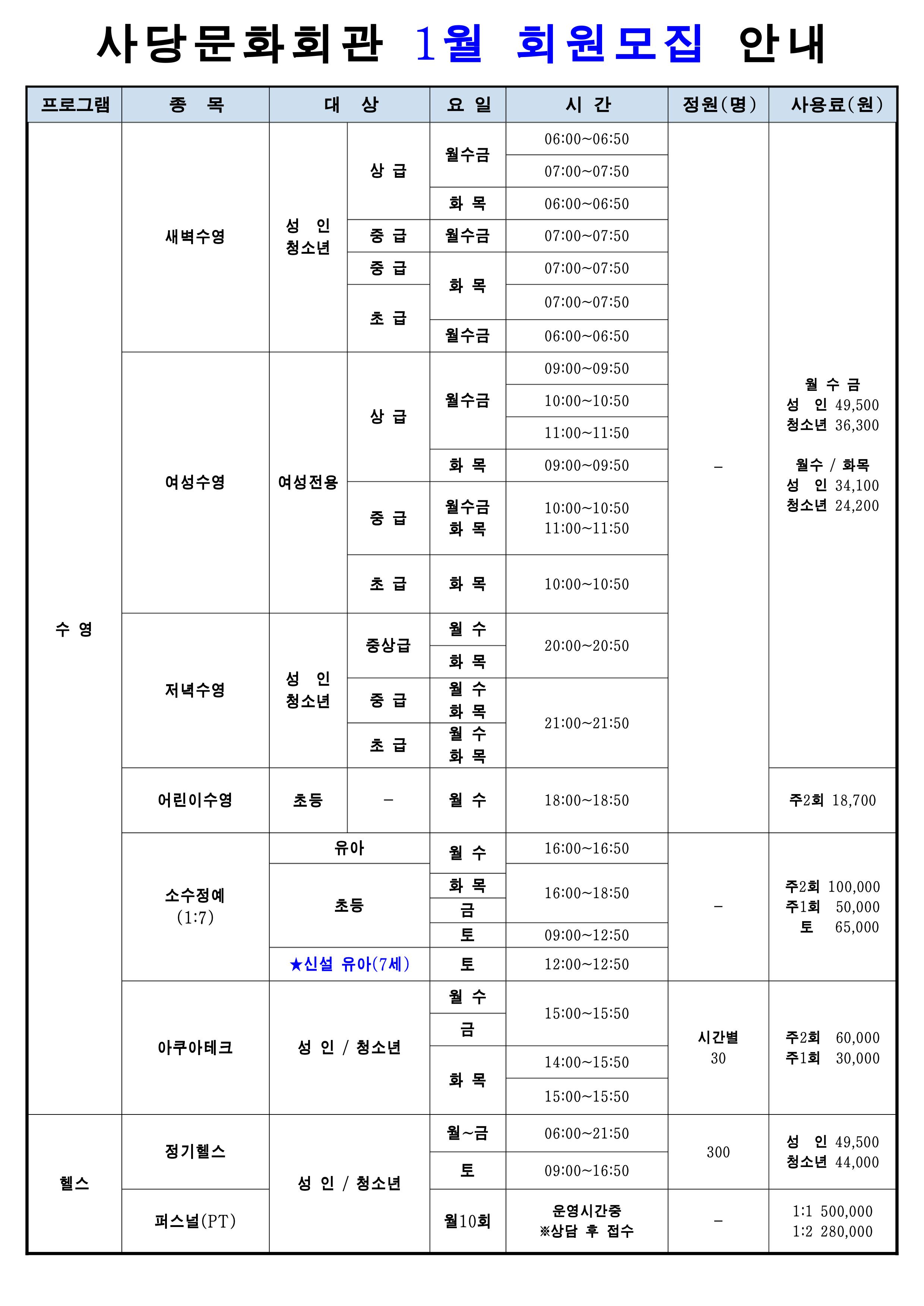 사당문화회관 사당문화회관 2023년 1월 회원모집 안내 작성자 동작구민체육센터 작성일 2022년 12월 15일 9시 37분 53초 조회 871 0001.jpg [ Size : 540.27KB , Down : 611 ] 미리보기 다운로드 0002.jpg [ Size : 647.48KB , Down : 640 ] 미리보기 다운로드 목록보기
