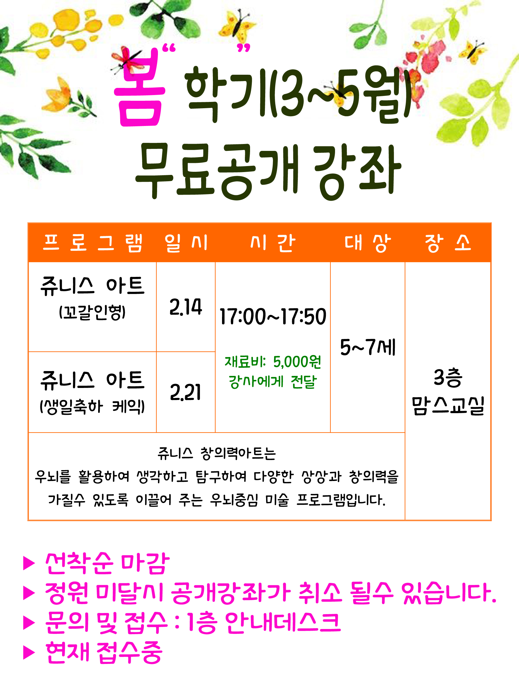 사당문화회관 사당문화회관 교육문화 무료 공개강좌 안내 작성자 사당문화회관 작성일 2020년 2월 17일 11시 6분 54초 조회 1,567 봄학기 무료공개 강좌A1-2.jpg [ Size : 1.25MB , Down : 1,069 ] 미리보기 다운로드 목록보기
