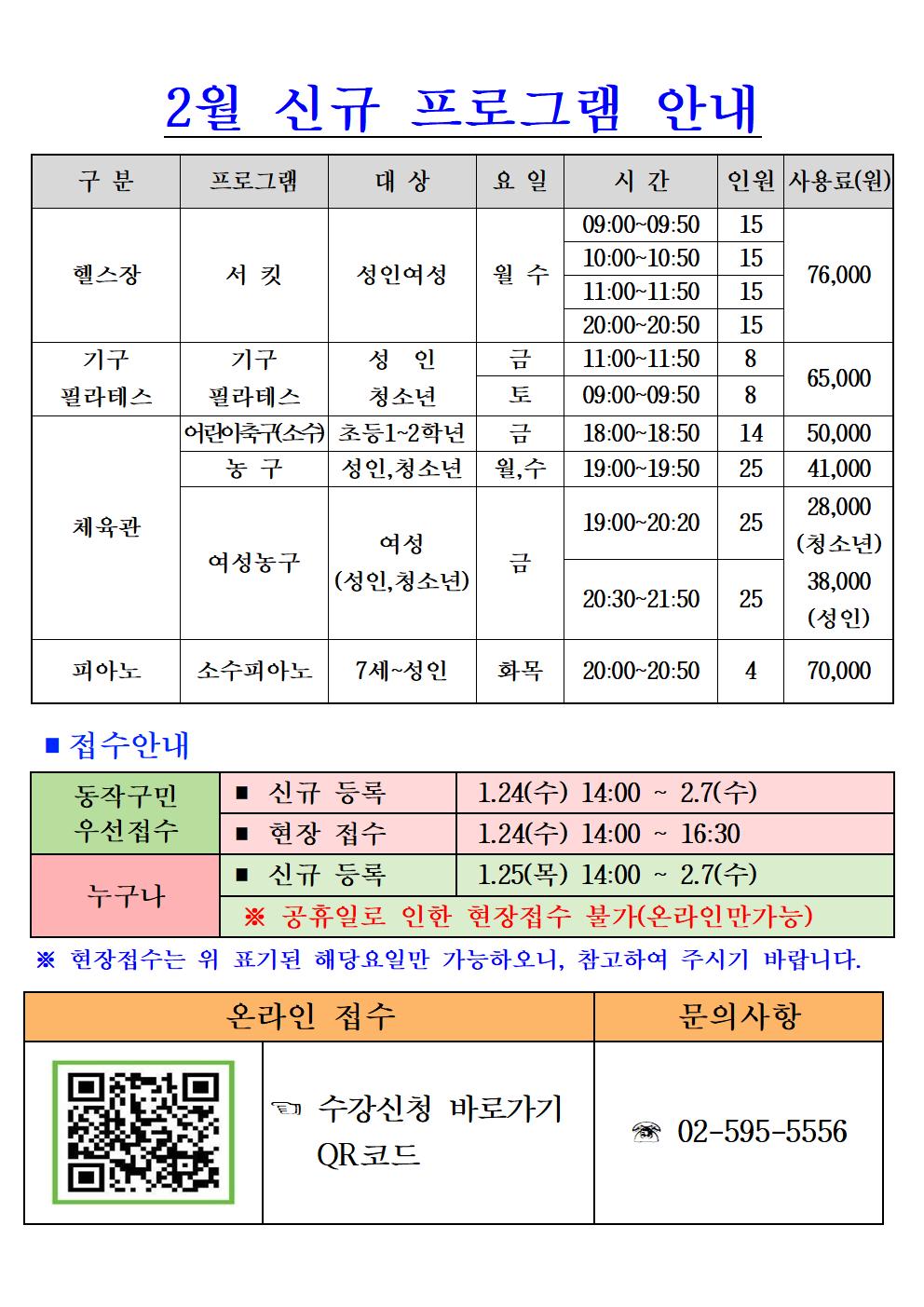 사당종합체육관 사당종합체육관 2월 신규프로그램 안내 작성자 동작구민체육센터 작성일 2024년 1월 21일 12시 46분 14초 조회 652 2월 신규 프로그램(체육관, 다목적)24.1.21001.jpg [ Size : 195.88KB , Down : 279 ] 미리보기 다운로드 목록보기