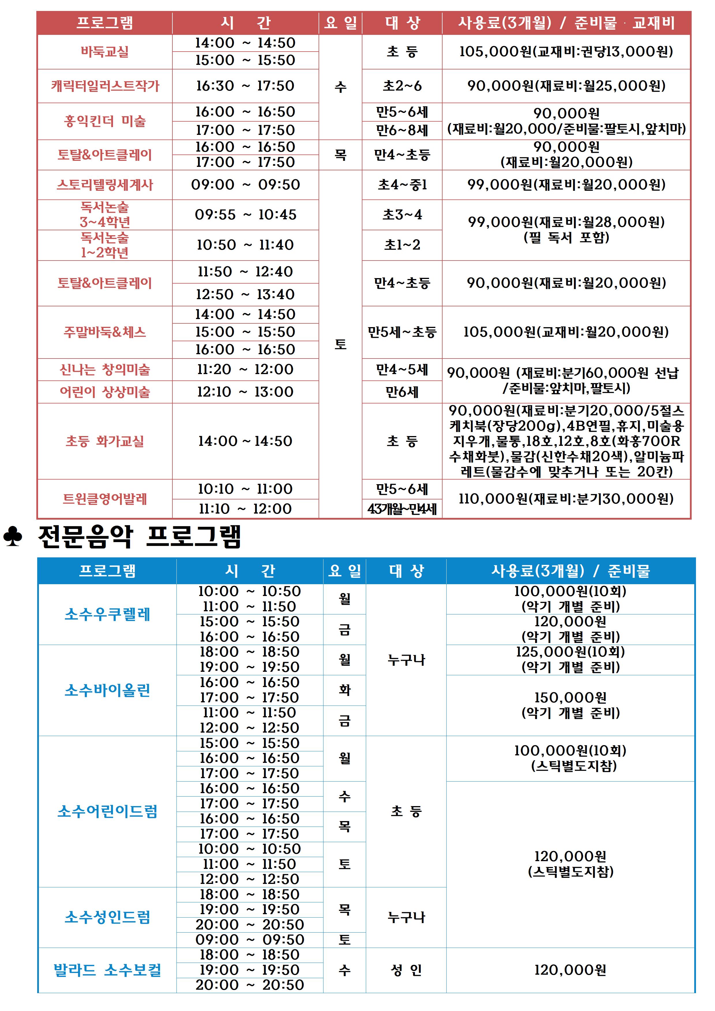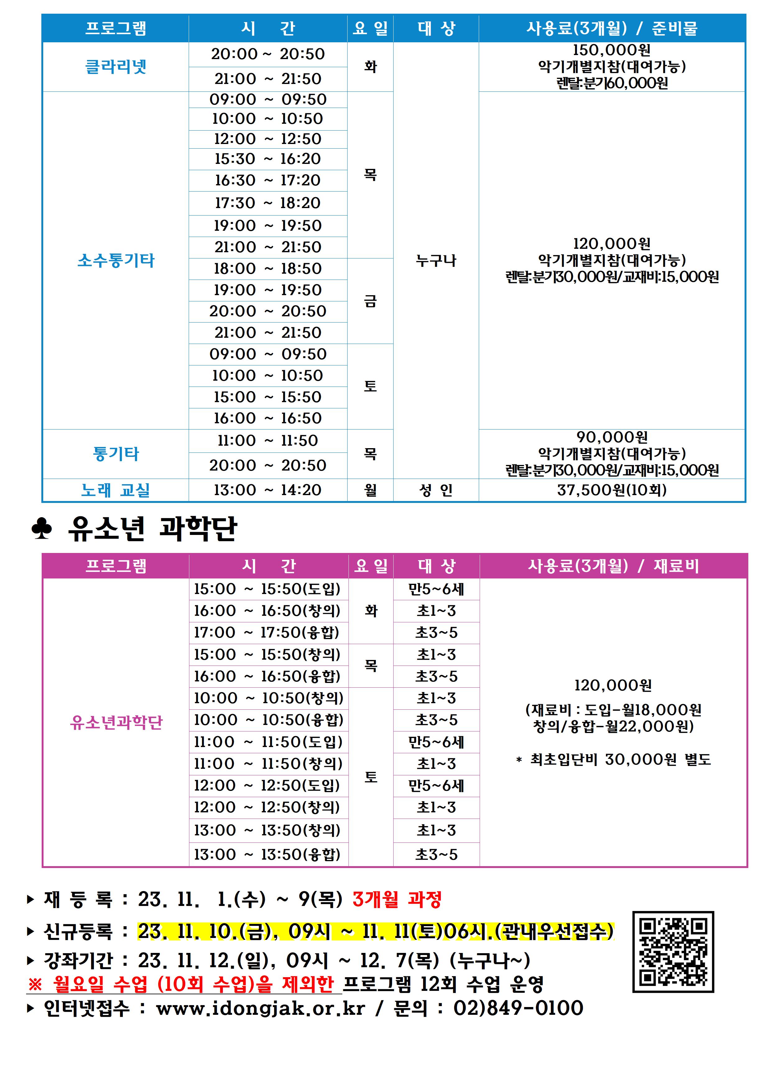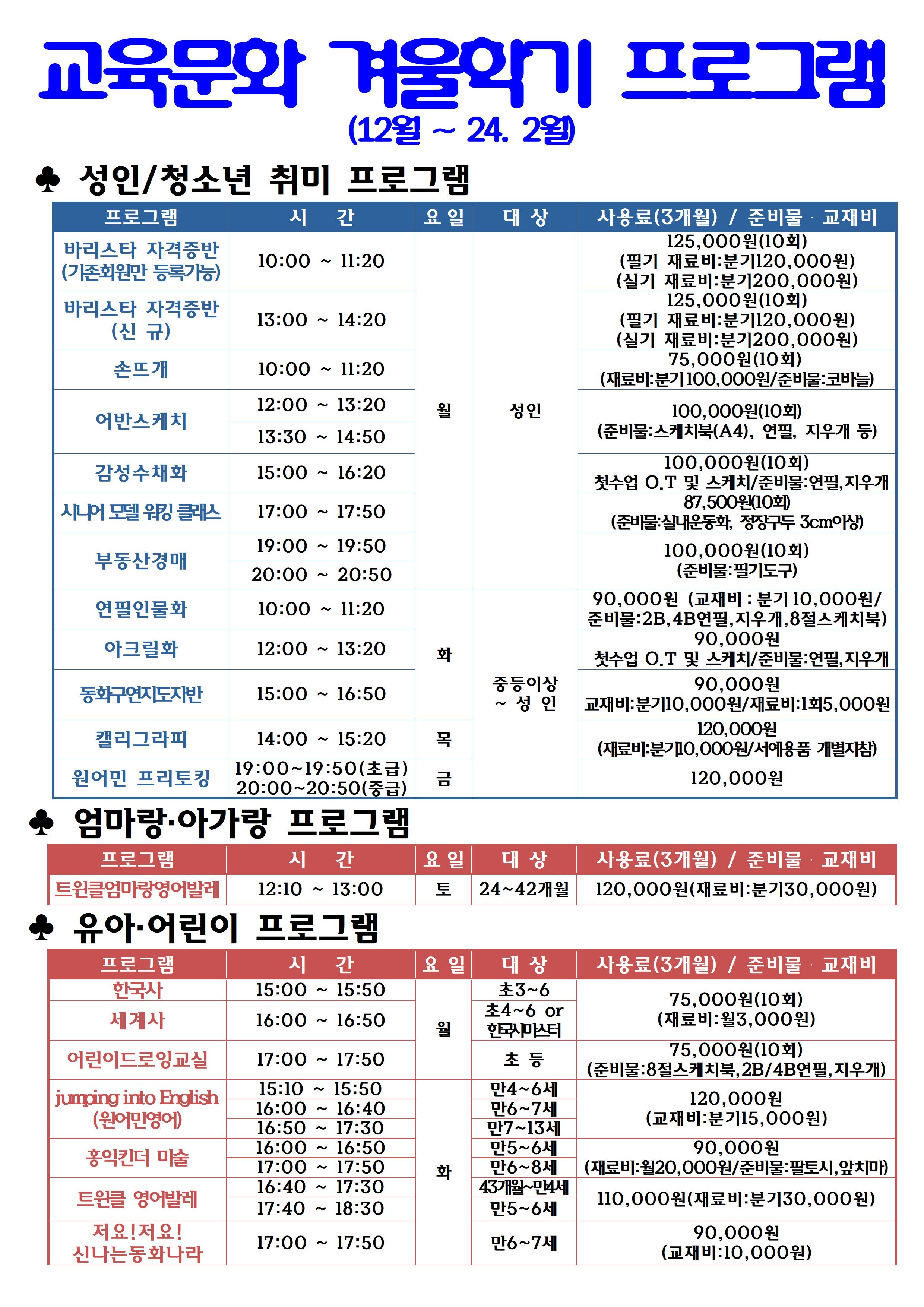 동작구민체육센터 동작구민체육센터 교육문화 겨울학기(12월~24년 2월)3개월 회원모집 안내 작성자 동작구민체육센터 작성일 2023년 10월 31일 18시 20분 8초 조회 729 2023 겨울학기 홍보물(a0)최종 23.10. 25001.jpg [ Size : 1.01MB , Down : 596 ] 미리보기 다운로드 2023 겨울학기 홍보물(a0)최종 23.10. 25002.jpg [ Size : 960.97KB , Down : 556 ] 미리보기 다운로드 2023 겨울학기 홍보물(a0)최종 23.10. 25003.jpg [ Size : 767.97KB , Down : 570 ] 미리보기 다운로드 목록보기