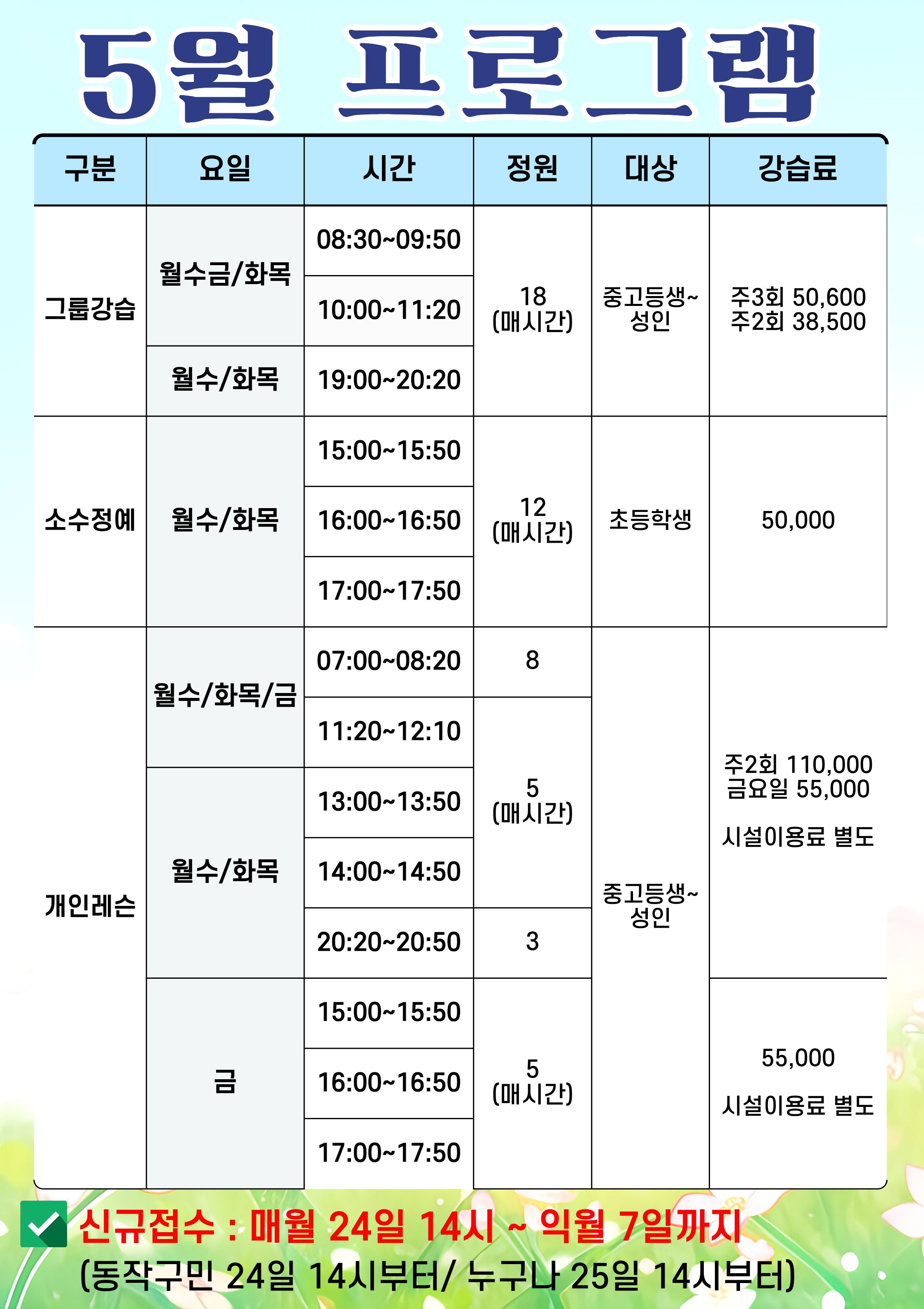 현충실내배드민턴장 현충실내배드민턴장 5월 프로그램 안내 작성자 상도스포츠클럽 작성일 2026년 4월 20일 15시 9분 56초 조회 14 5월 프로그램안내(홈페치지).jpg [ Size : 454.19KB , Down : 3 ] 미리보기 다운로드 목록보기