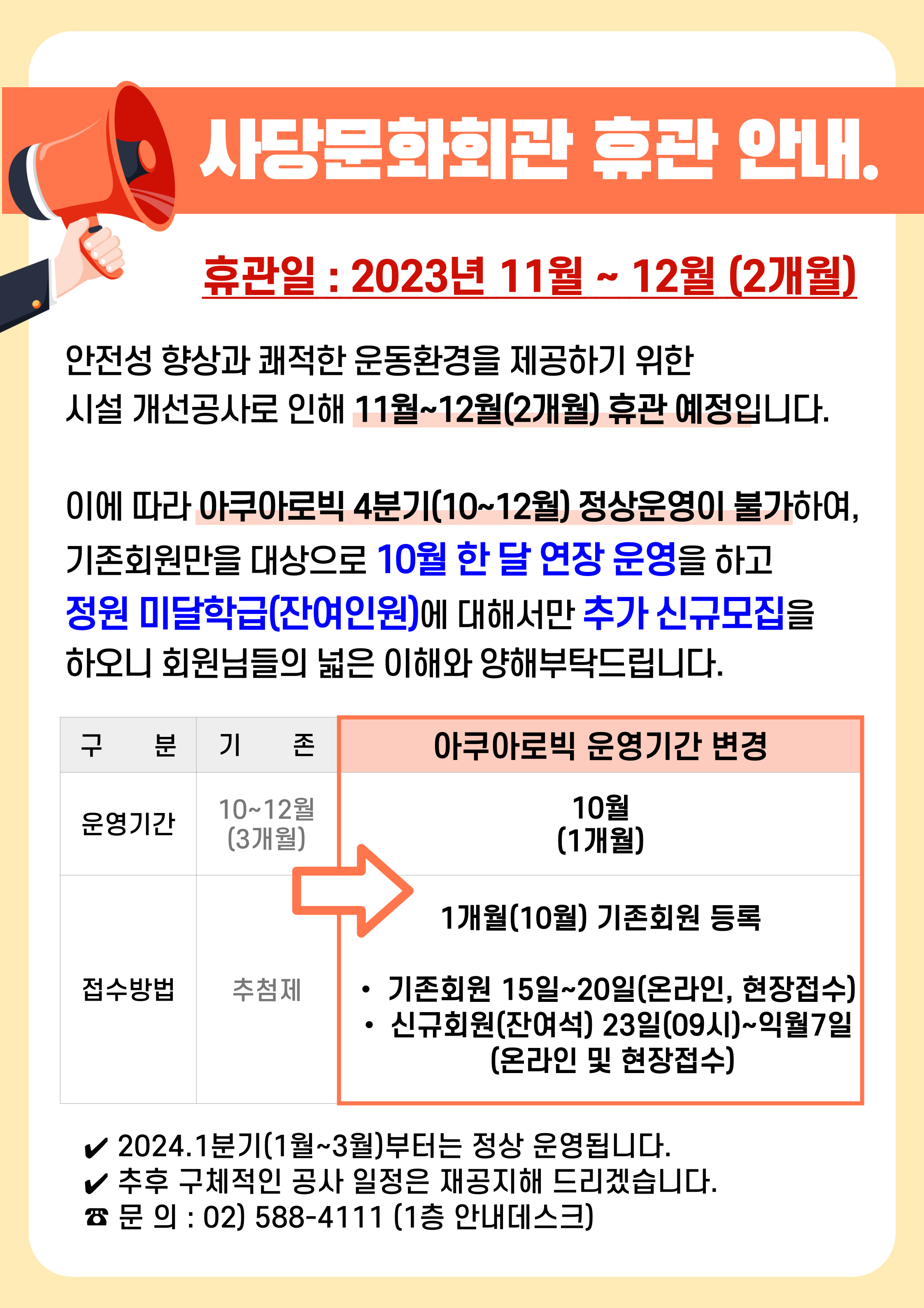사당문화회관 사당문화회관 10월 아쿠아 접수 일정 안내 작성자 동작구민체육센터 작성일 2023년 9월 11일 14시 25분 12초 조회 609 아쿠아 10월 접수.png [ Size : 549.71KB , Down : 250 ] 미리보기 다운로드 목록보기