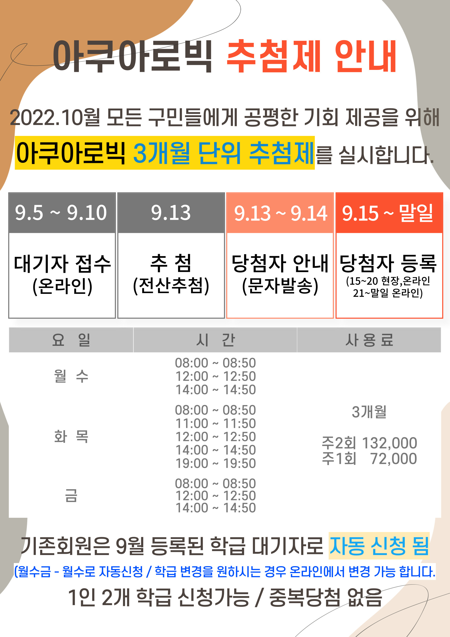 동작구민체육센터 동작구민체육센터 아쿠아로빅 추첨제 안내 작성자 사당문화회관 작성일 2022년 8월 30일 12시 57분 7초 조회 867 아쿠아로빅 최종 8.26.jpg [ Size : 616.12KB , Down : 277 ] 미리보기 다운로드 목록보기