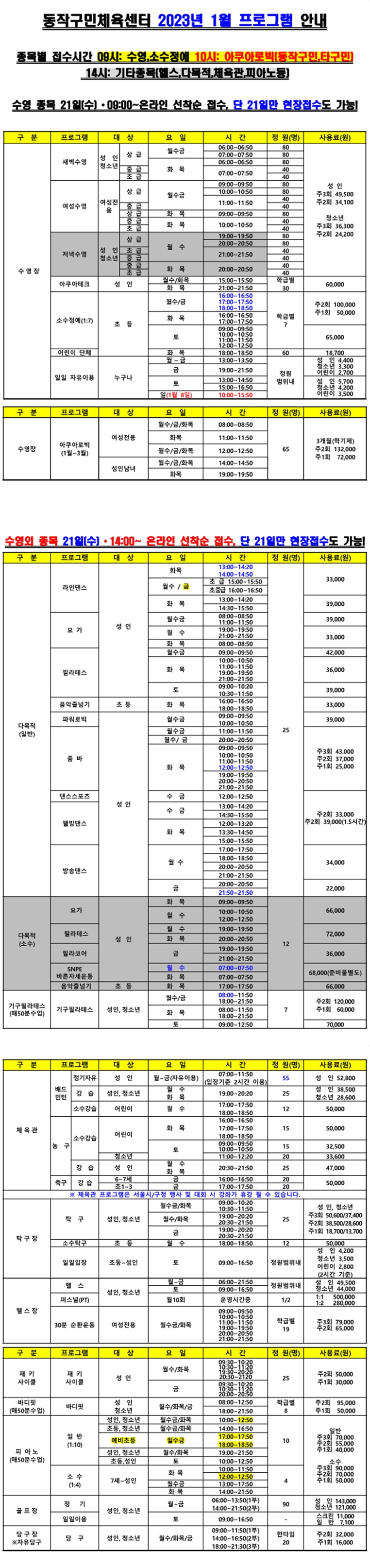 동작구민체육센터 동작구민체육센터 2023년 1월 프로그램 안내 작성자 사당문화회관 작성일 2022년 12월 19일 10시 22분 22초 조회 989 23년1월 프로그램 안내 동작구민체육센터 홈페이지용 12.19.jpg [ Size : 1019.66KB , Down : 501 ] 미리보기 다운로드 목록보기