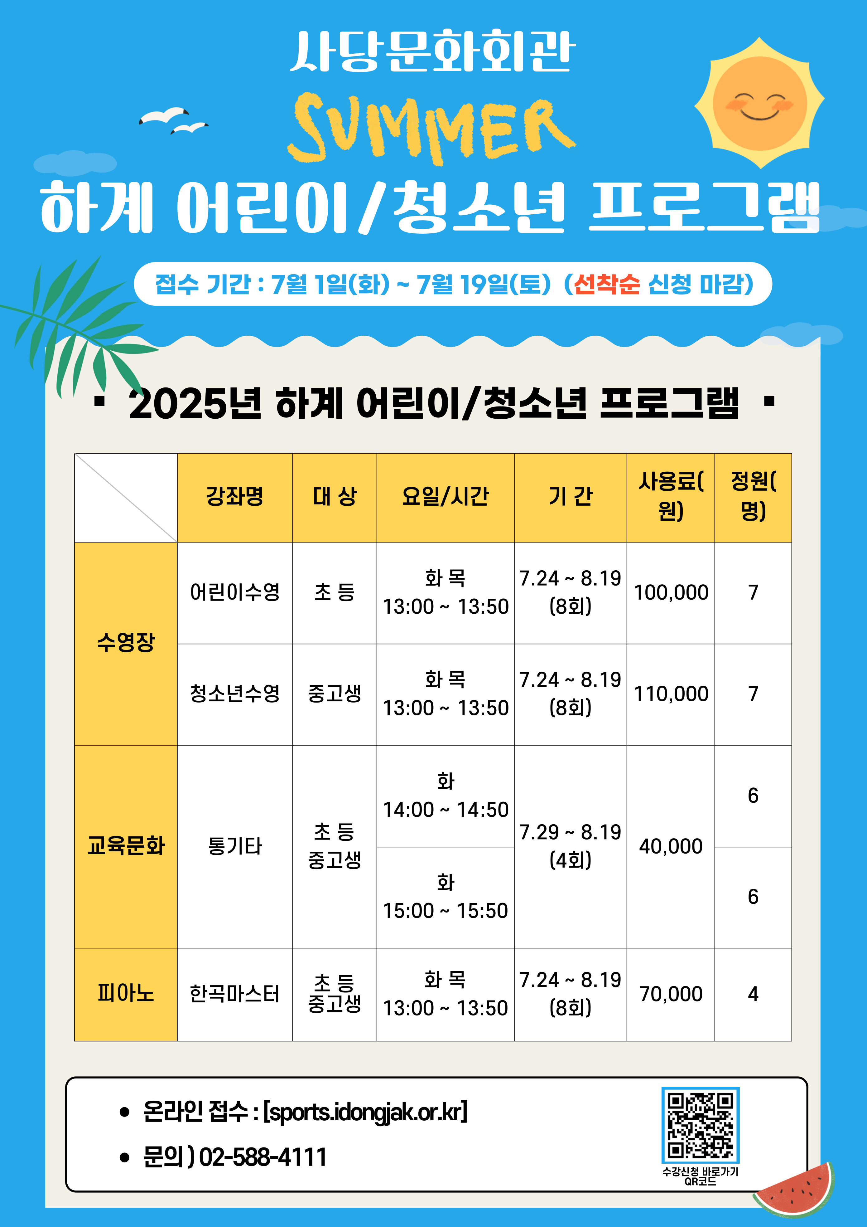 사당문화회관 사당문화회관 하계 어린이/청소년 프로그램 안내 작성자 사당문화회관 작성일 2025년 6월 23일 13시 2분 8초 조회 535 KakaoTalk_20250623_111806048.jpg [ Size : 978.32KB , Down : 114 ] 미리보기 다운로드 목록보기