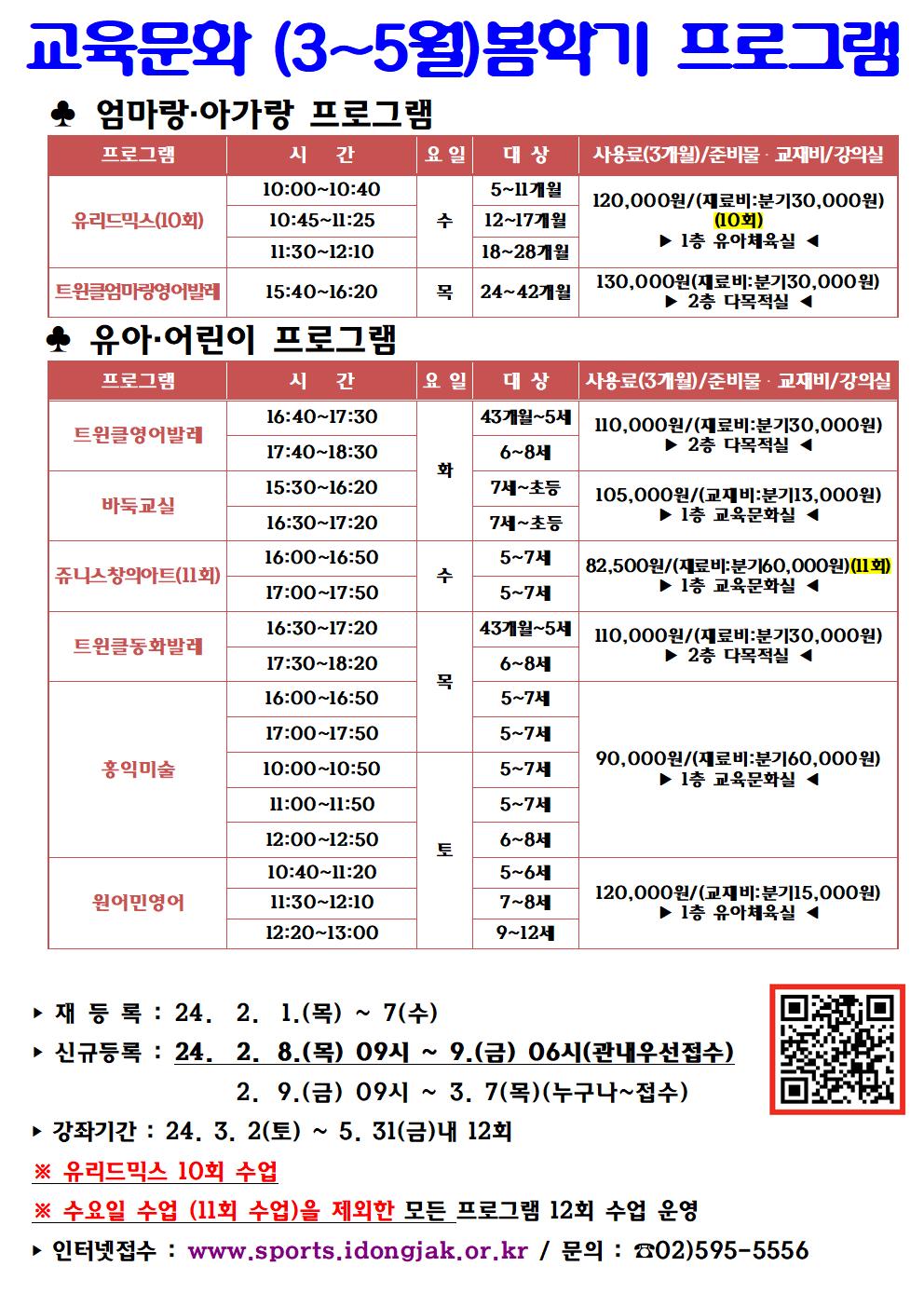 사당종합체육관 사당종합 체육관 봄학기(3~5월) 아가랑 엄마및 유아 교육문화 프로그램 작성자 동작구민체육센터 작성일 2024년 1월 18일 16시 28분 12초 조회 604 2024 봄학기 엄마랑 아가랑유아001.jpg [ Size : 247.03KB , Down : 220 ] 미리보기 다운로드 목록보기