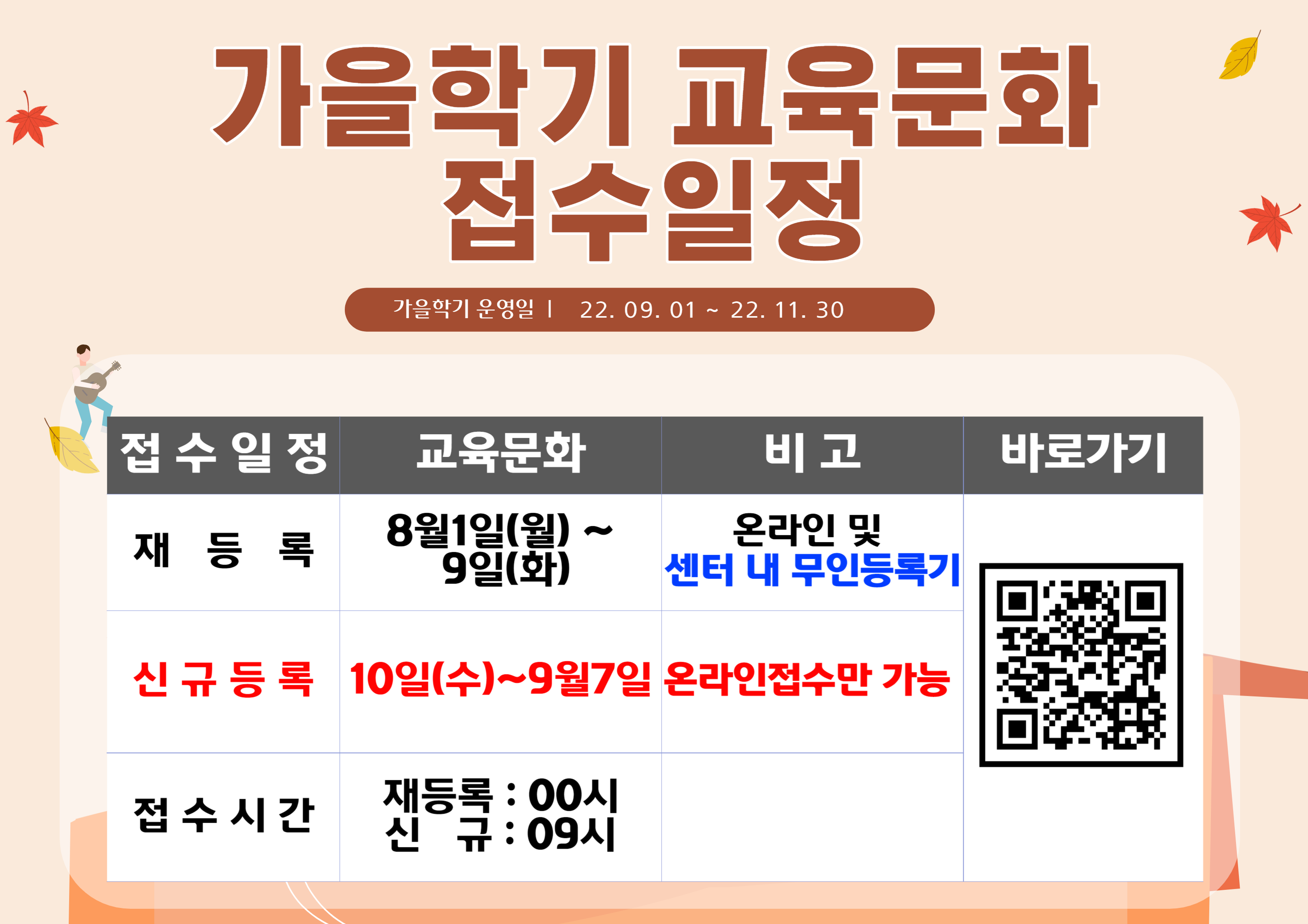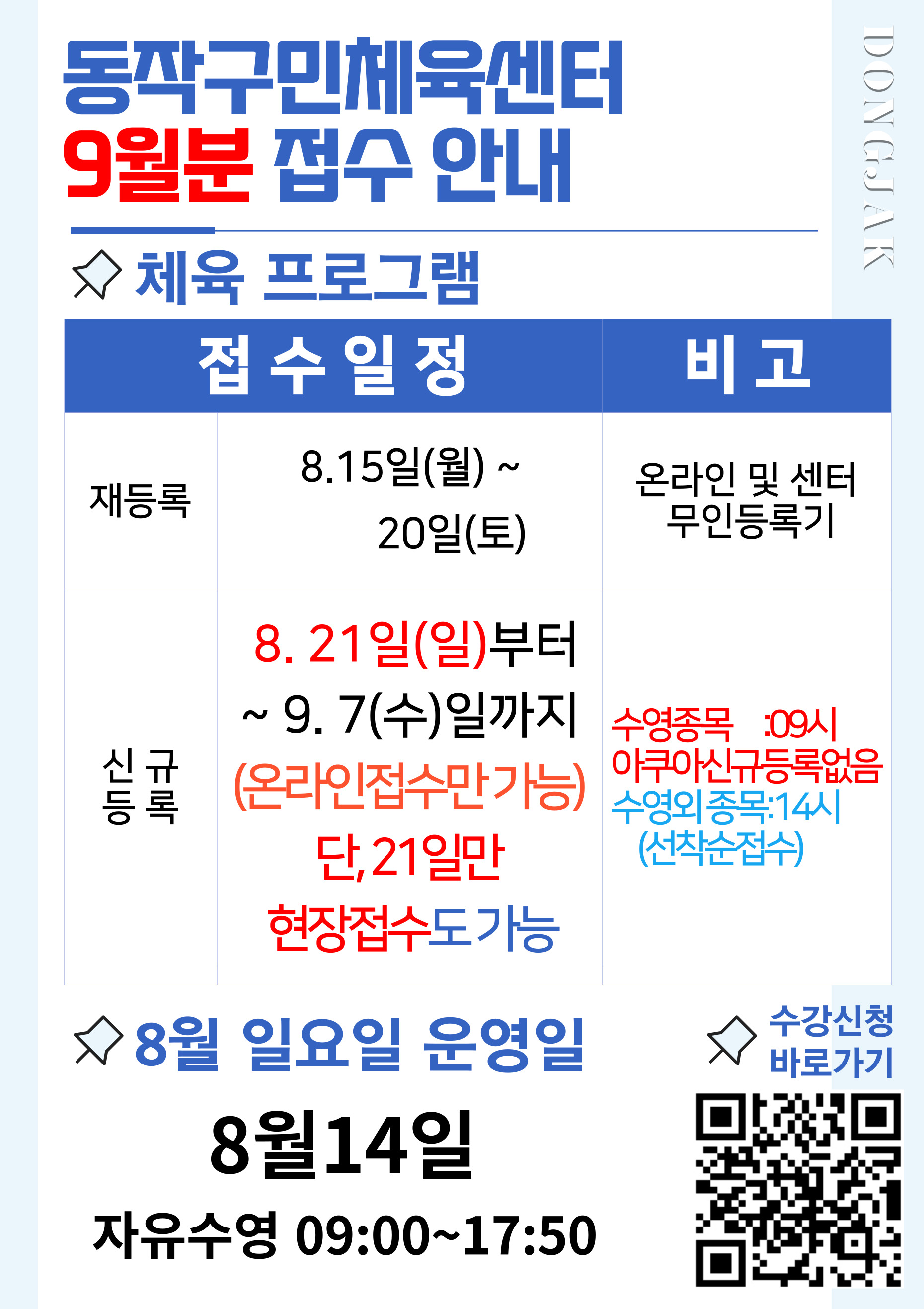 동작구민체육센터 동작구민체육센터 9월분 체육 프로그램 및 교육문화 접수 일정 안내 작성자 사당문화회관 작성일 2022년 8월 5일 15시 14분 11초 조회 996 동작 출력용 A1 -5장.jpg [ Size : 617.54KB , Down : 589 ] 미리보기 다운로드 가을학기 접수안내.jpg [ Size : 1.04MB , Down : 625 ] 미리보기 다운로드 ▶ 동작구민체육센터 9월분 체육 프로그램 접수 일정 ▶ 동작구민체육센터 9월~11월 가을학기 교육문화 프로그램 접수 일정 목록보기