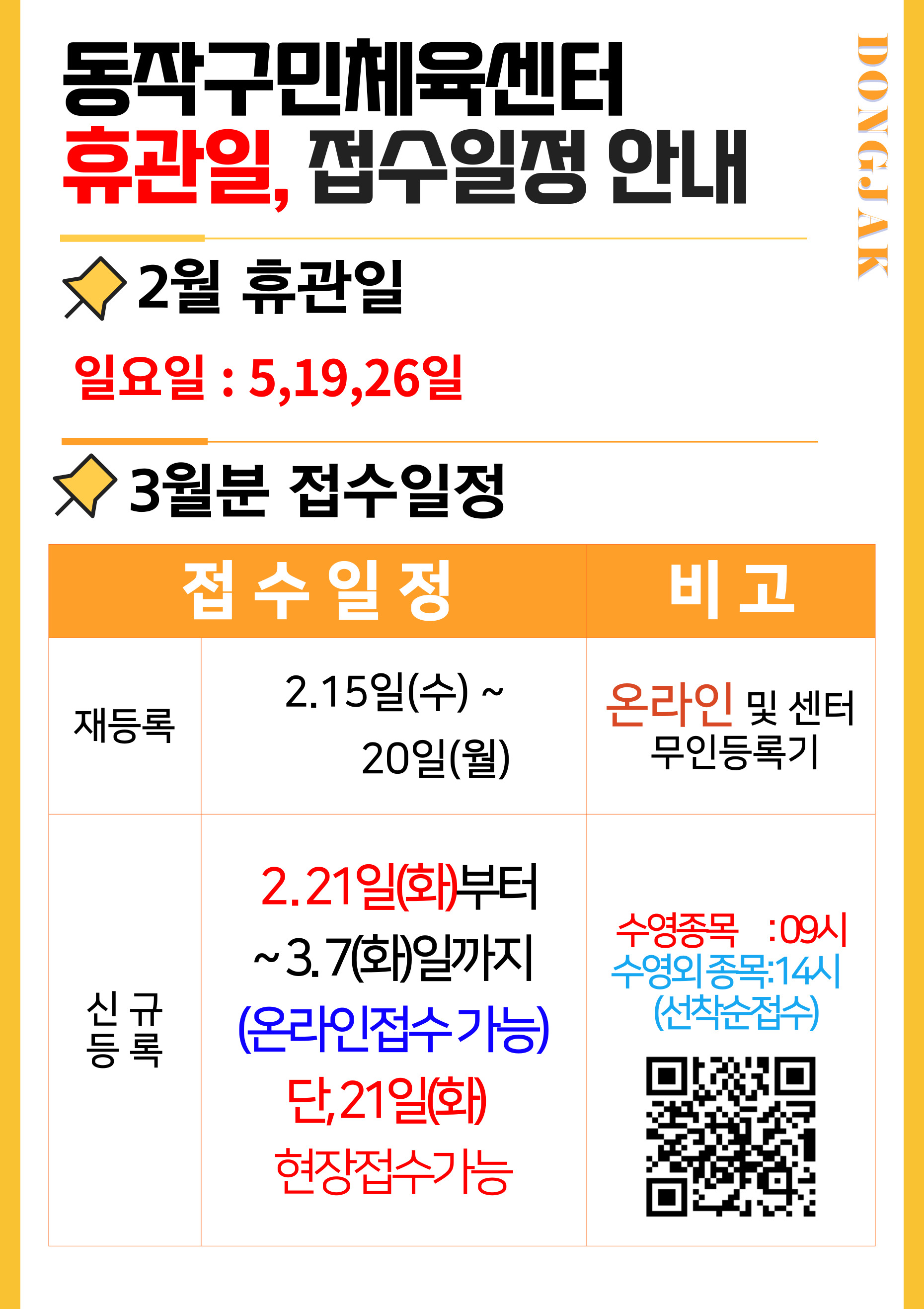 동작구민체육센터 동작구민체육센터 3월분 접수 일정안내 작성자 사당문화회관 작성일 2023년 2월 7일 14시 16분 0초 조회 1,028 3월 접수일정.jpg [ Size : 573.84KB , Down : 561 ] 미리보기 다운로드 목록보기
