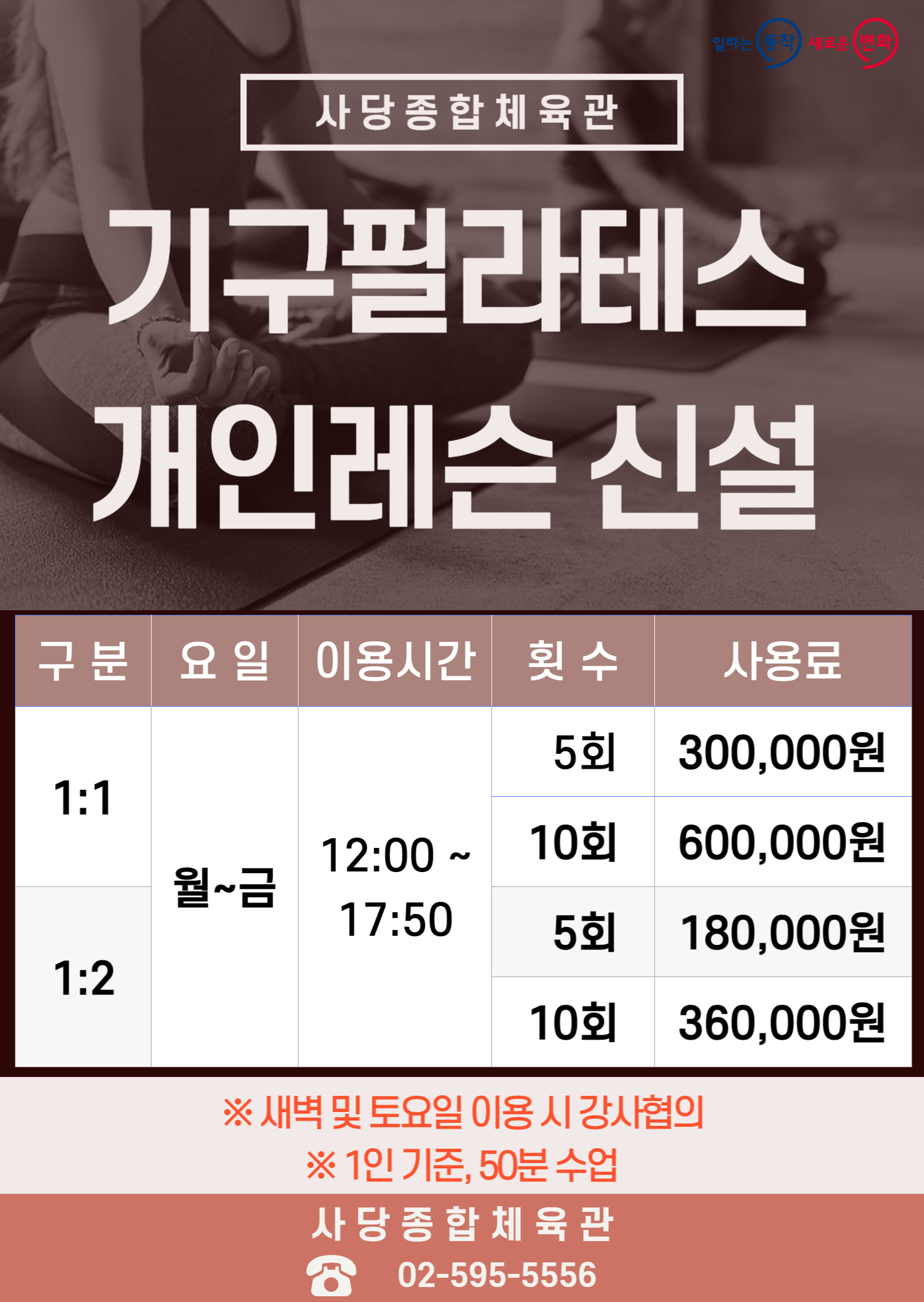 사당종합체육관 사당종합체육관 기구필라테스 개인레슨 신설 안내 작성자 동작구민체육센터 작성일 2023년 12월 14일 15시 10분 26초 조회 569 기구필라테스 개인레슨 홍보물 A1_3장.jpg [ Size : 947.25KB , Down : 288 ] 미리보기 다운로드 목록보기