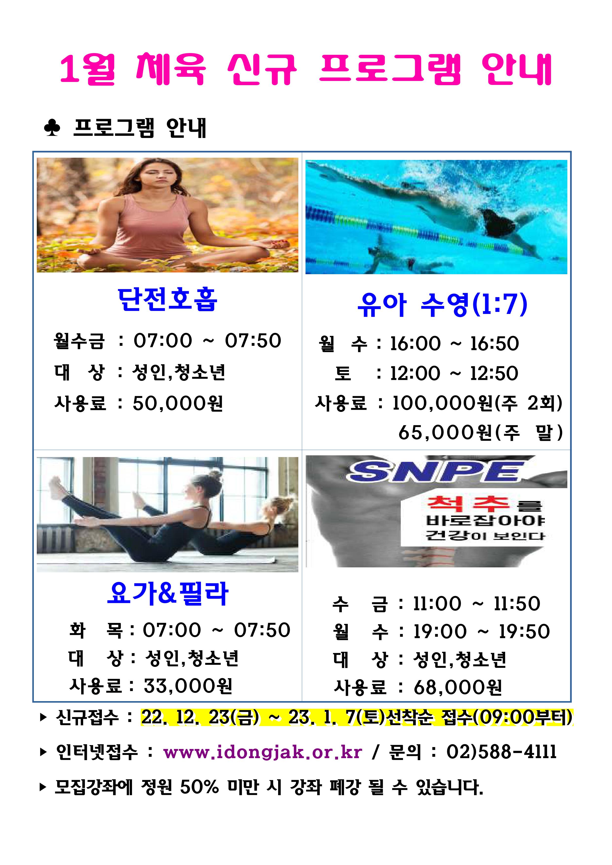 사당문화회관 사당문화회관 2023년 1월 체육 신규프로그램 회원모집 안내 작성자 동작구민체육센터 작성일 2022년 12월 15일 11시 39분 23초 조회 845 1월 체육프로그램.jpg [ Size : 695.36KB , Down : 675 ] 미리보기 다운로드 목록보기