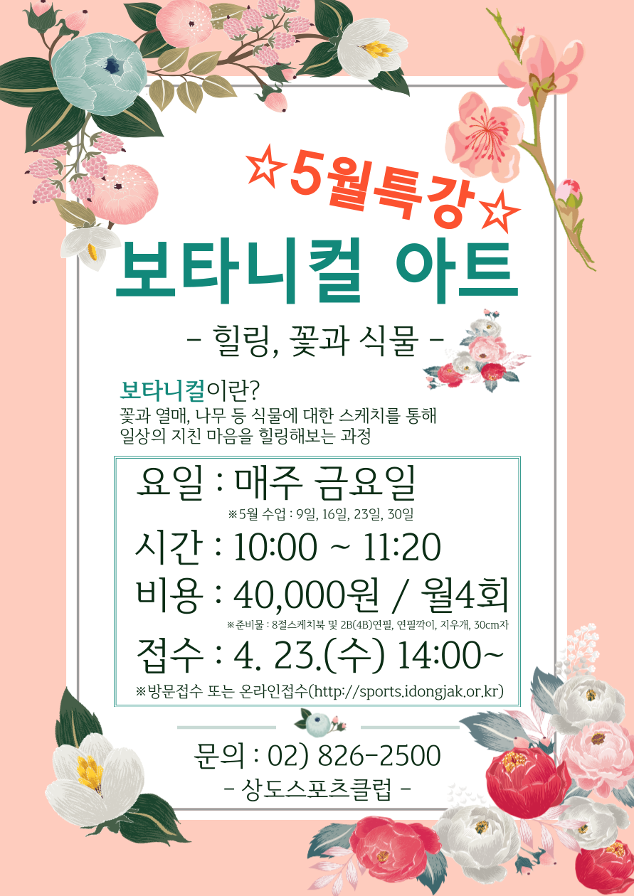 상도스포츠클럽 상도스포츠클럽 5월 신설 프로그램 [보타니컬 아트] 안내 및 회원모집 작성자 상도스포츠클럽 작성일 2025년 4월 9일 13시 2분 56초 조회 556 보타닉아트안내문.png [ Size : 591.44KB , Down : 255 ] 미리보기 다운로드 목록보기