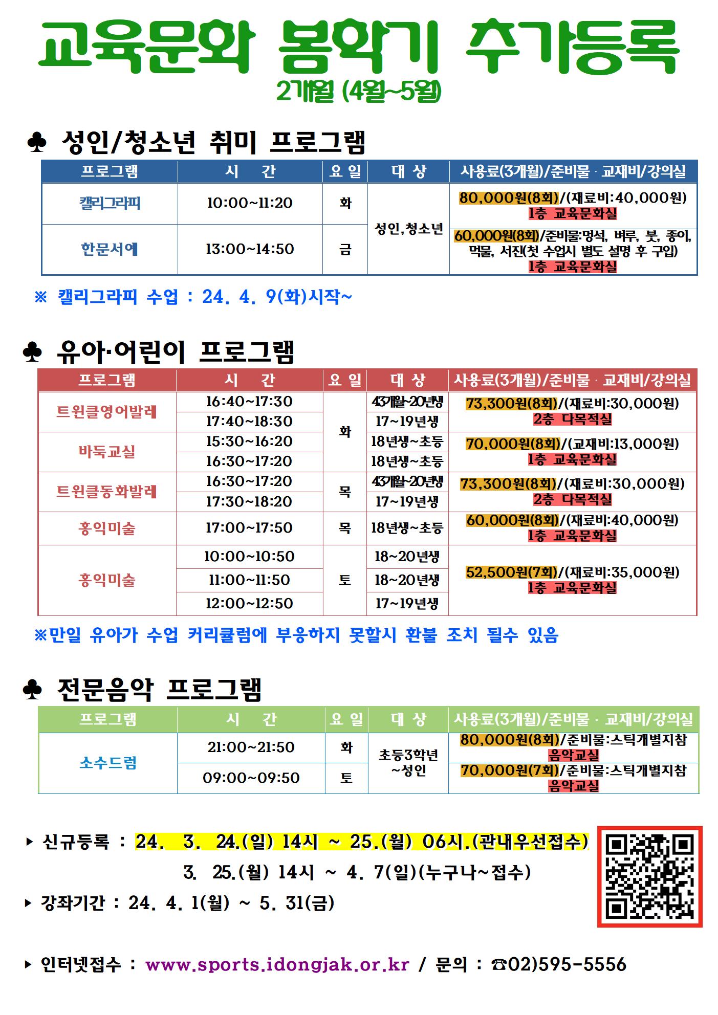 사당종합체육관 사당종합체육관 봄학기 교육문화(4~5월)2개월 모집 안내 작성자 동작구민체육센터 작성일 2024년 3월 18일 10시 51분 42초 조회 647 교육문화 봄학기 추가등록(2개월)홍보물001.jpg [ Size : 387.52KB , Down : 196 ] 미리보기 다운로드 목록보기